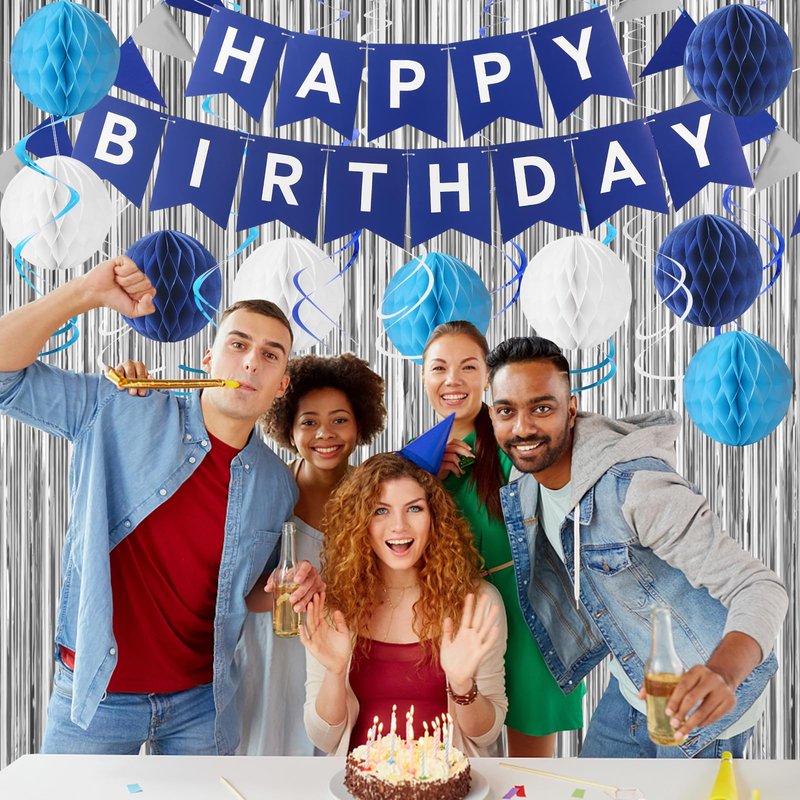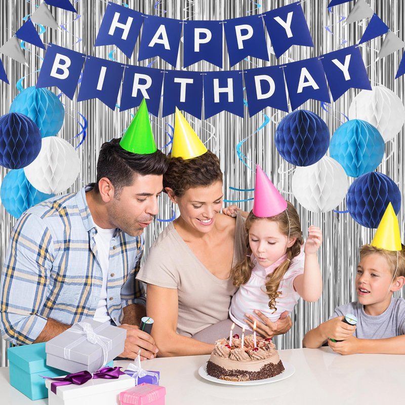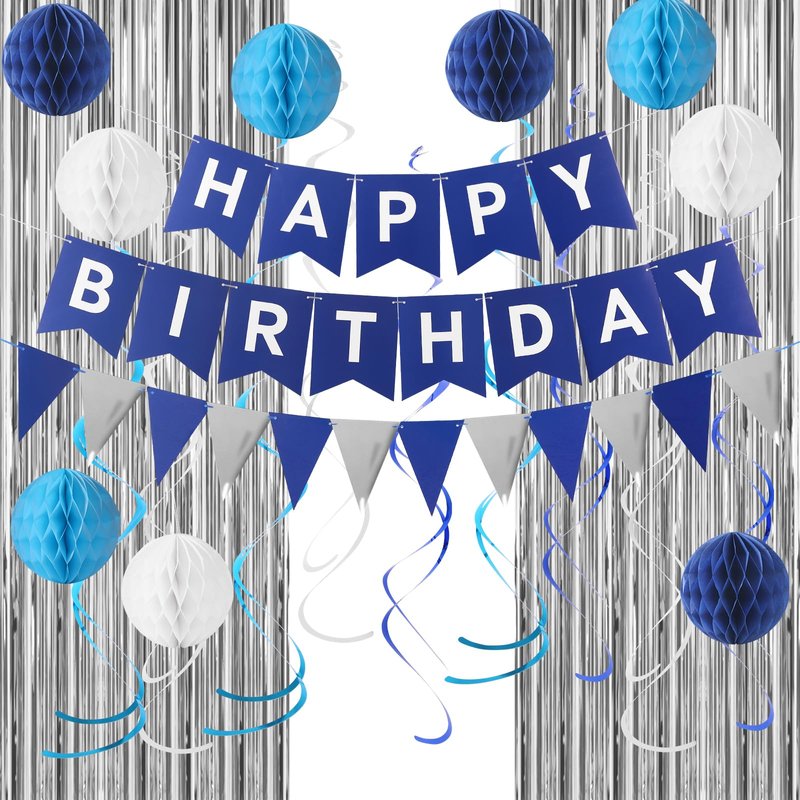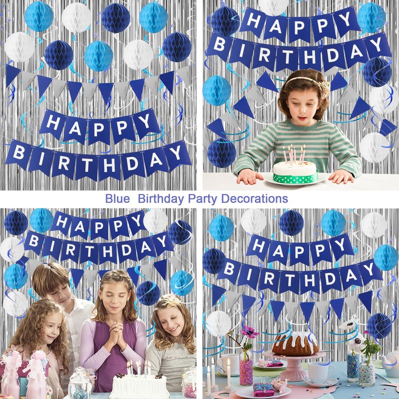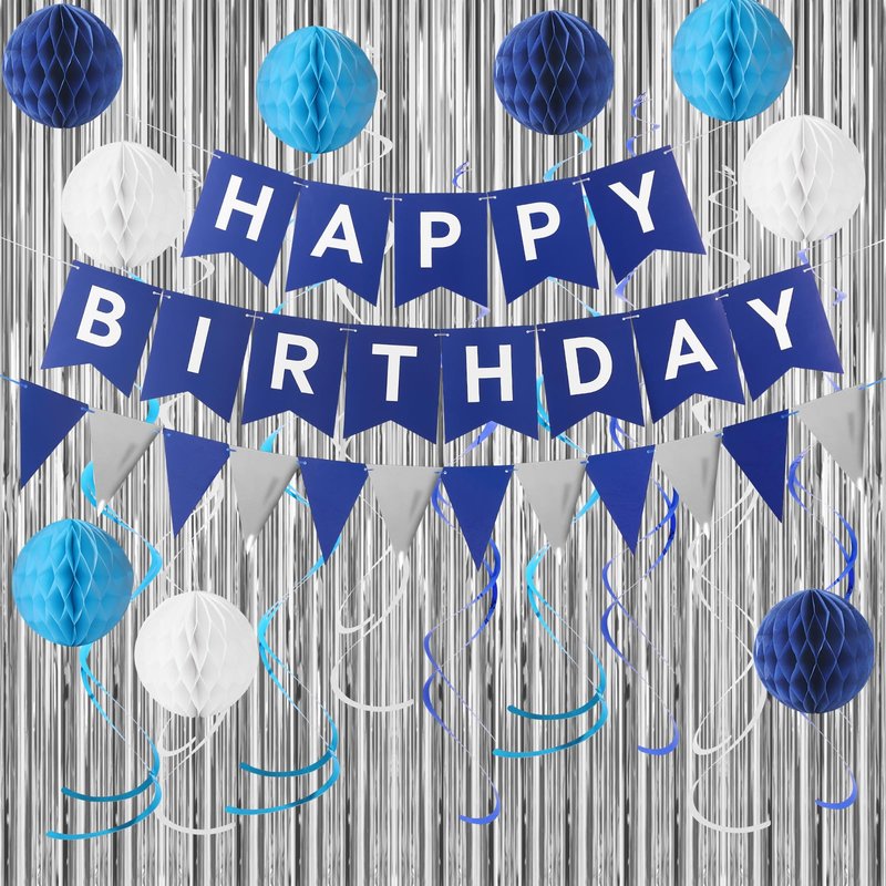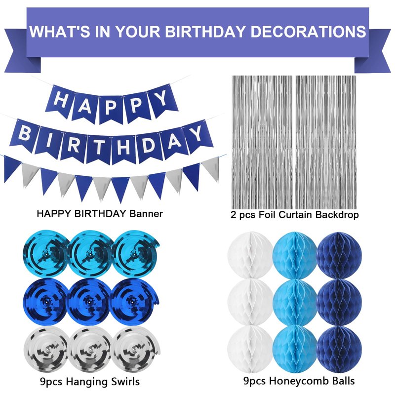 - 【The set includes】 Blue Happy Birthday Banner,navy Blue Triangle flags ,2 pcs silvery foil curtain Background decoration, 9 pcs hanging swirls, 9 pcs honeycomb balls.celebrate in style with our blue birthday decorations kit,ideal for boys birthday party decor.create a festive atmosphere with our birthday decorations kit, suitable for women, men, and boy.