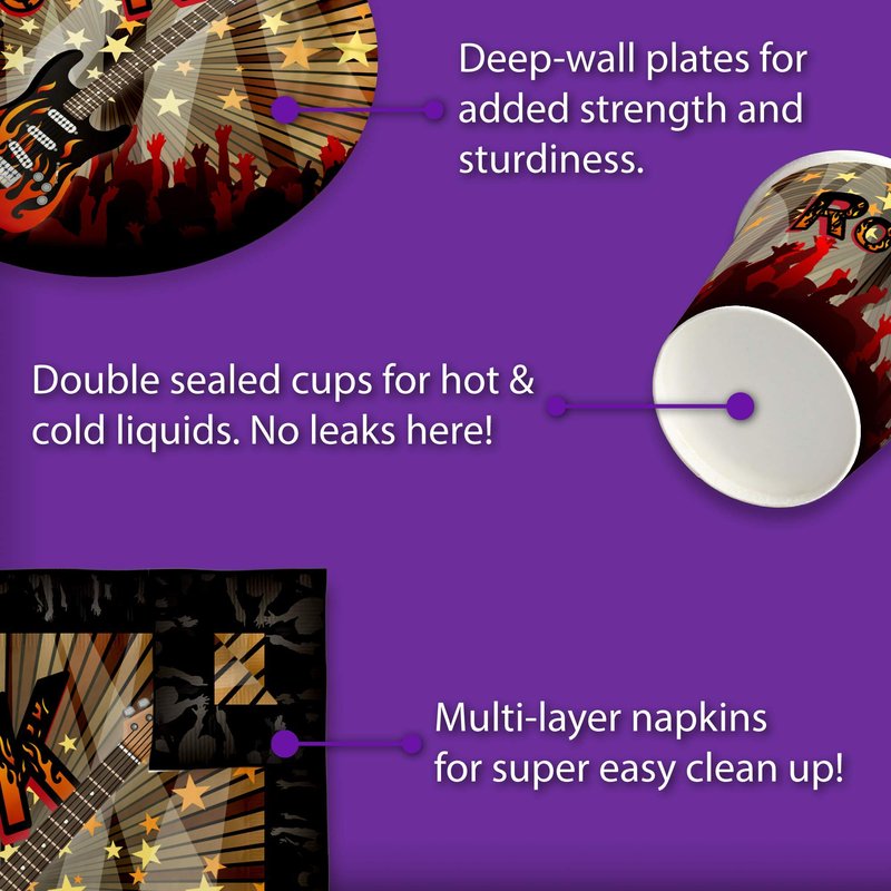 - PREMIUM DESIGN - Our Rockstar Themed Party Supplies are suitable for girl’s and boy’s birthday parties, holiday celebrations with your family and friends, special events or for just fun-filled daily meals, snacks, and desserts with picnics and cookouts. Shrieks of joy will be your reward when you use these fun and unique party tableware sets.