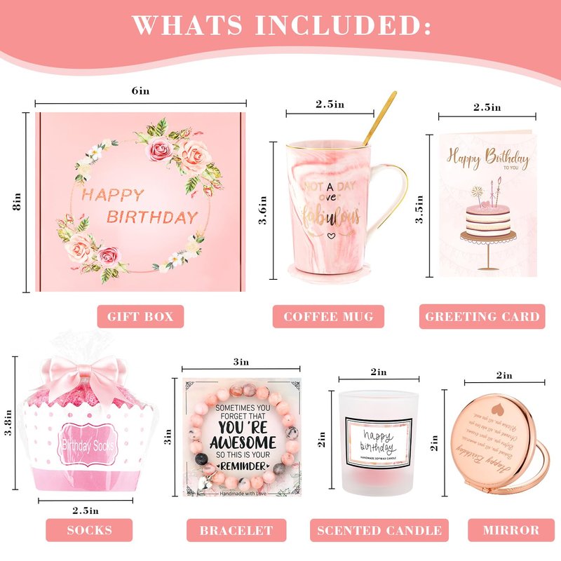 - Unique Birthday Gifts for Her: Are you looking for the perfect birthday-themed gift for that special lady in your life? This happy birthday gift for women is your best choice. The elegant birthday basket gifts for women contains 6 items: 1* 12 oz ceramic mug (with lid and spoon), 1* rose gold mirror, 1* soy scented candle, 1* natural stone bracelet, 1* pair of birthday socks, 1* birthday cake card.