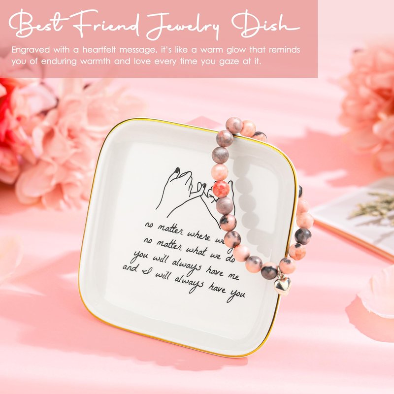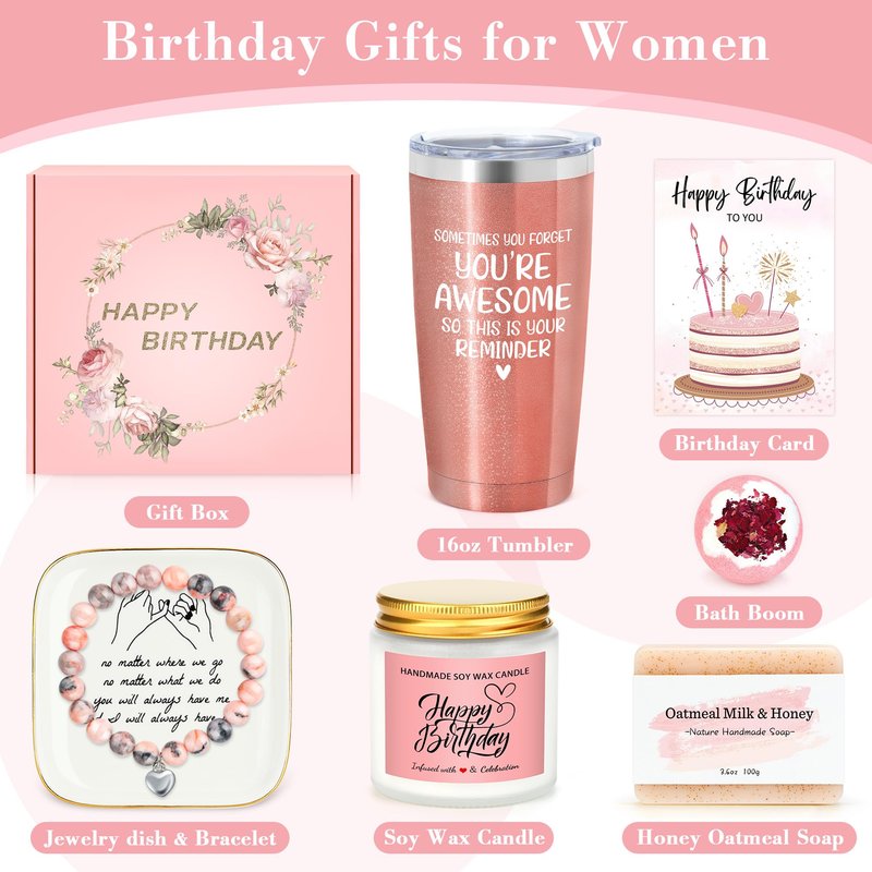 - Birthday Gift Sets for Women: This stunning best friend birthday gifts ideas includes: 1* 20 oz insulated stainless steel travel tumbler 1*chic ceramic jewelry tray 1*beaded bracelet, a floral scented candle 1* handmade natural oatmeal soap 1* rose bath bomb 1* beautiful birthday card All these items are neatly packaged in a lovely birthday gifts for best friend box, ensuring she enjoys a wonderful birthday while conveying your blessings and love!