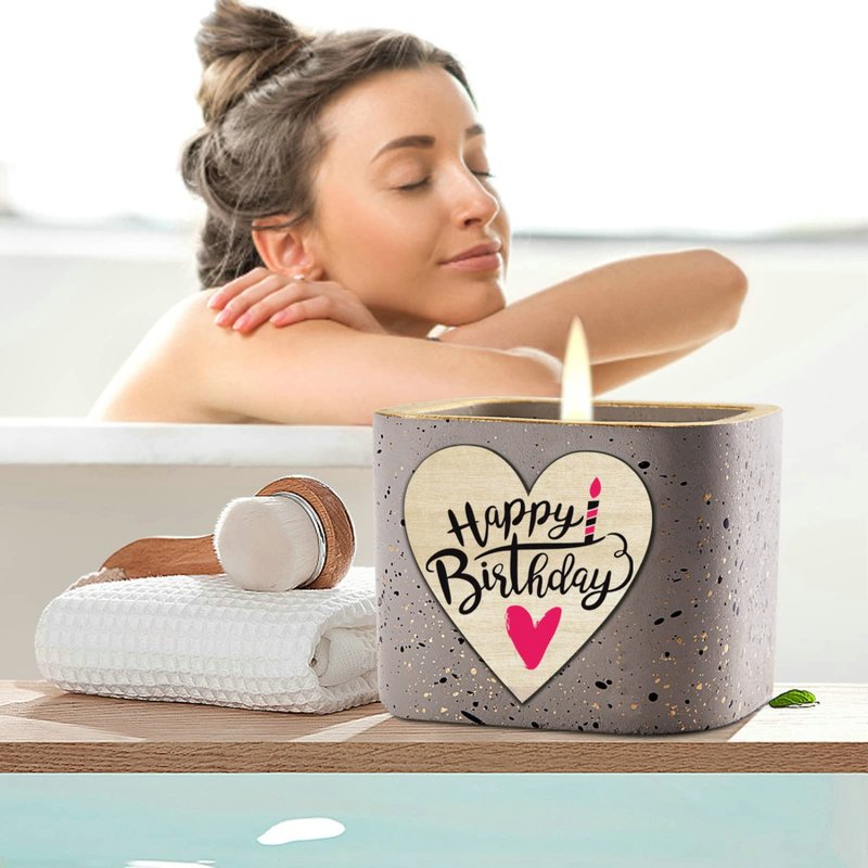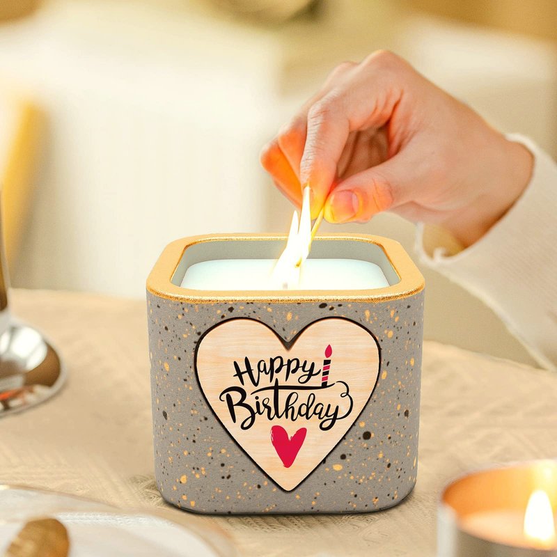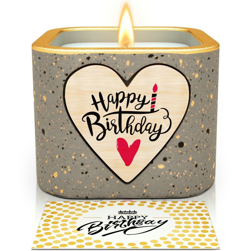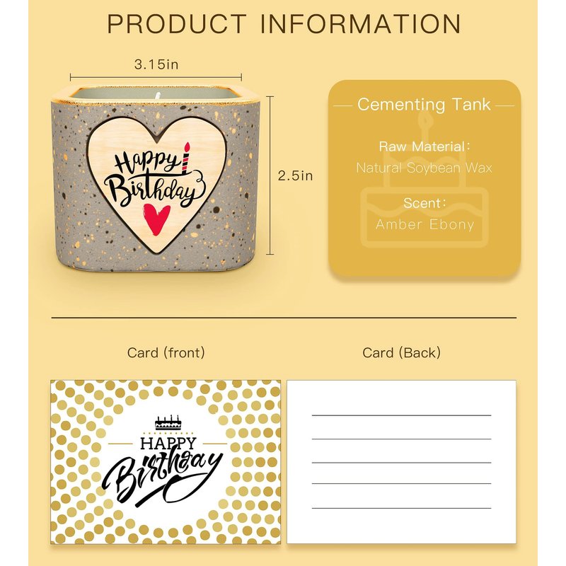 Product Contains A handmade scented candle with the pattern "BIRTHDAY" A exquisite card with the pattern "Happy Birthday" CANDLE SPECIFICATION Scent: Amber Ebony Candle Material: Premium-grade Soy Wax Approximate burn time: over 30 hours Dimensions: 3.5x 3.5x3.5Inch HIGHLIGHTS Non-toxic,No lead,No-plastics,Cruelty free--Never tested on animals Reusable container for a pretty decorative look--Get creativeShipping Summary: