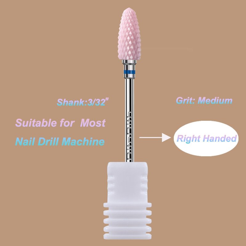 - Ceramic Nail Drill Bit: Shank Size: 3/32 inch. Use: Right Handed. Color: Pink. Grit: Medium.