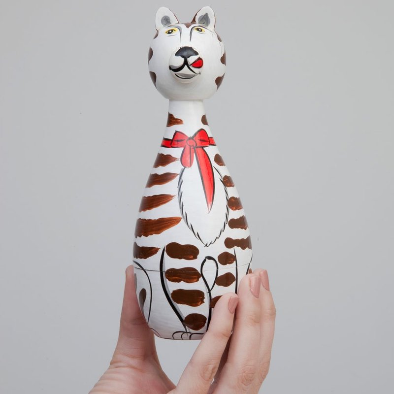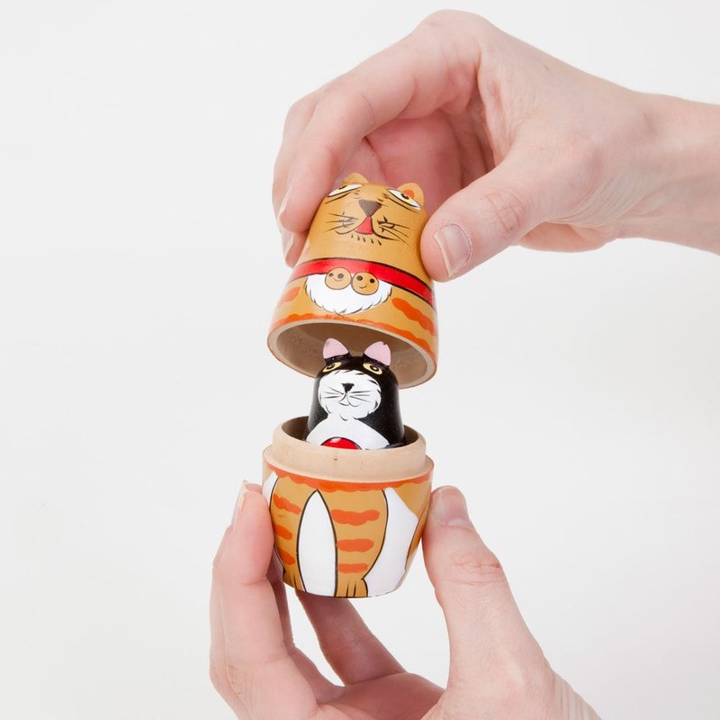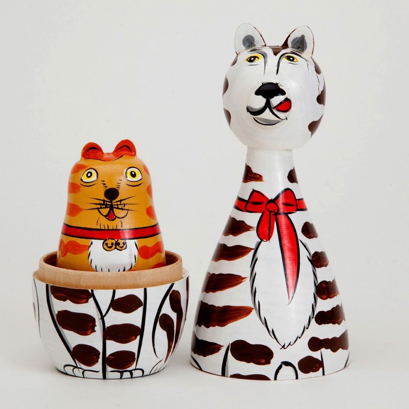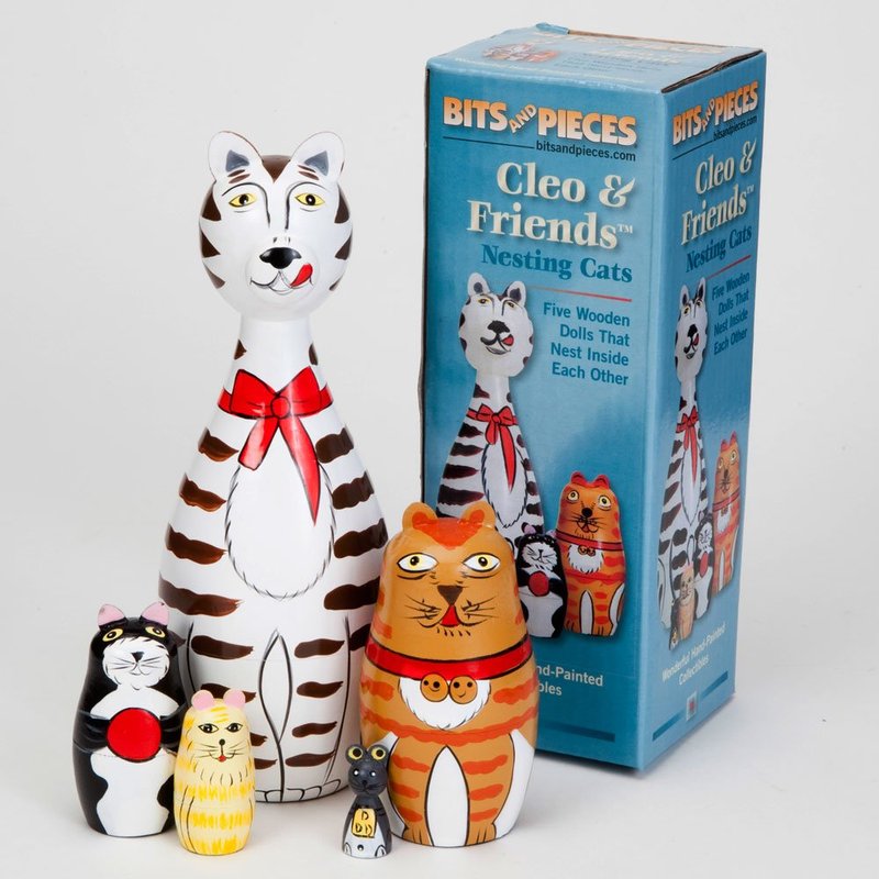 Cleo & Friends Nesting Cats is a set of wooden nesting dolls, also known as Russian dolls or Matryoshka dolls. The wooden dolls, designed to look like cats, each decrease in size and fit inside one another. There are four cat dolls in this set and the smallest, fifth doll is a tiny grey mouse holding a piece of cheese. Makes a great gift for cat lovers and fans of arts and crafts. The tallest of these nested dolls measures 7"