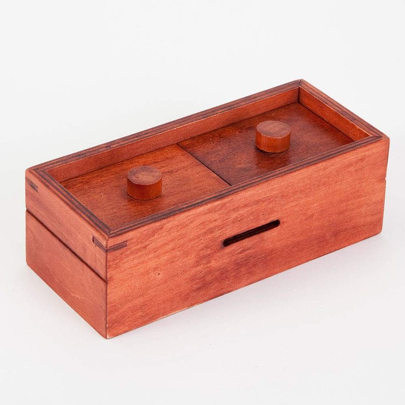 Our elegant puzzle box is the perfect place to stash your cash or hide a gift for any occasion. Just slide your coins and bills through the two slots on either side of this clever puzzle box, then try to find the challenging solution to opening it. Made of pine wood, finished in a warm cherry-toned stain. 5 7/8 x 2 1/2 x 2 5/8. Solution included