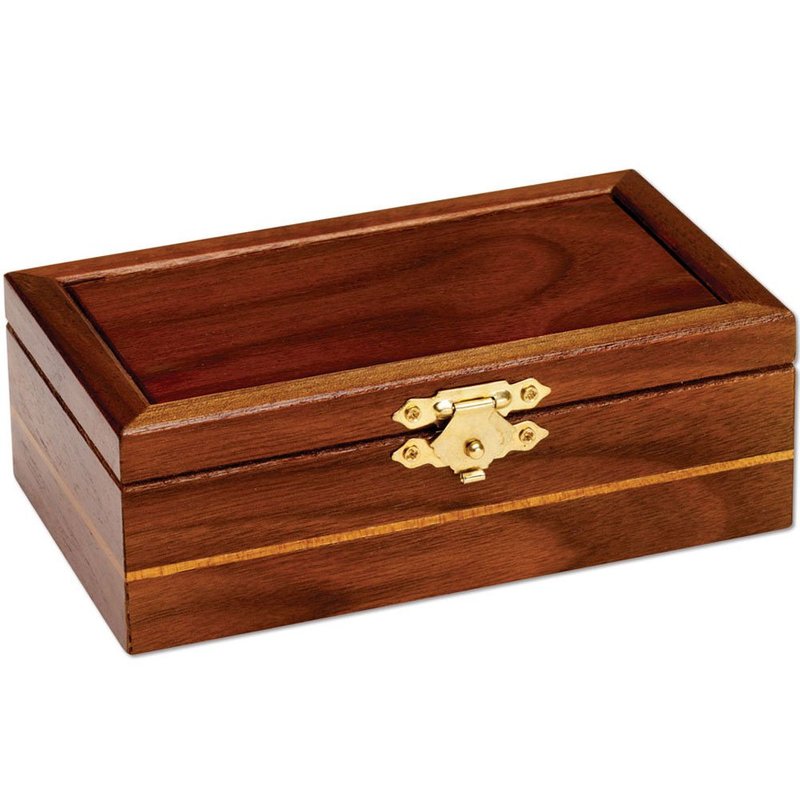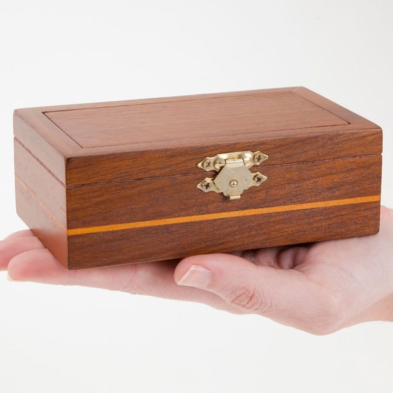 This stylish wooden box looks easy enough to open, but lift the brass hinge and you will find it's much more tricky than you think to access the chamber within. Made of walnut measuring 5" long x 3" wide x 1-3/4" tall. Solution included.