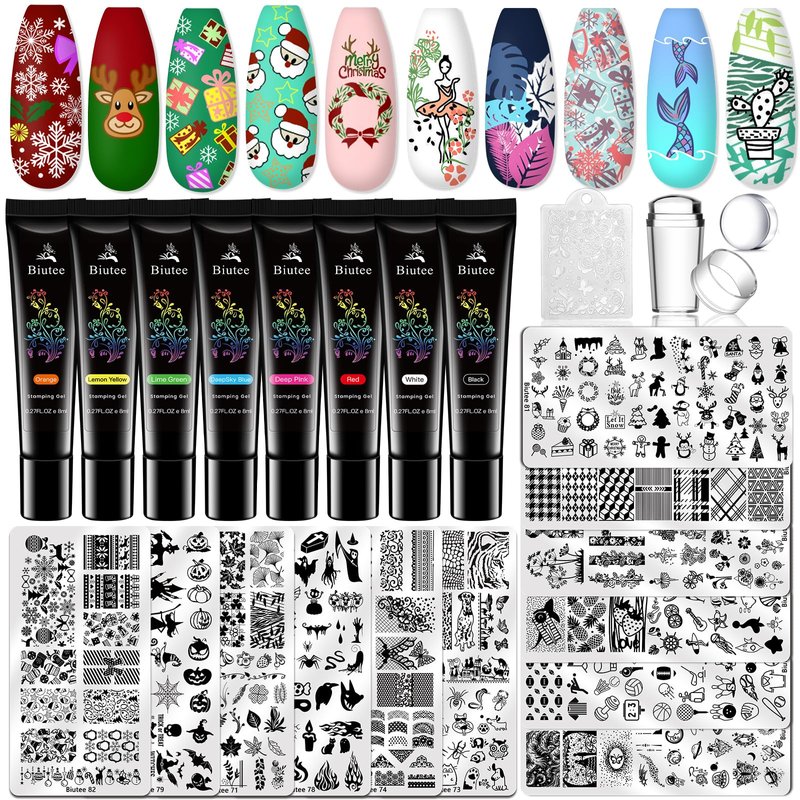 Biutee Nail Stamper Kit Nail Art Stamping Plate Set 8 Stamping Nail Polish Gel 12 Stamp Plate Jelly Silicone Stamper Flower Animal Lace Girl StarTemplate Tool Supplies Christmas style design