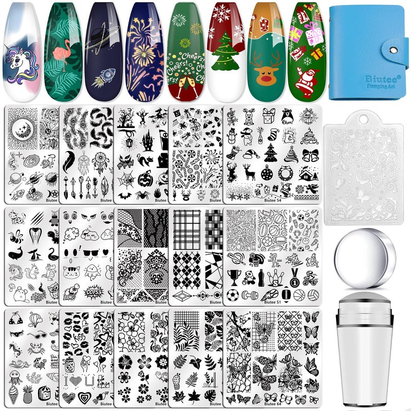 Biutee Nail Stamping Plates Set 15 pcs Nail Art Stamper Scraper Storage Bag Gift Box Nail Stamp Template Kit Lace Flower Butterfly Star Holiday Christmas Design Nail Image Plate