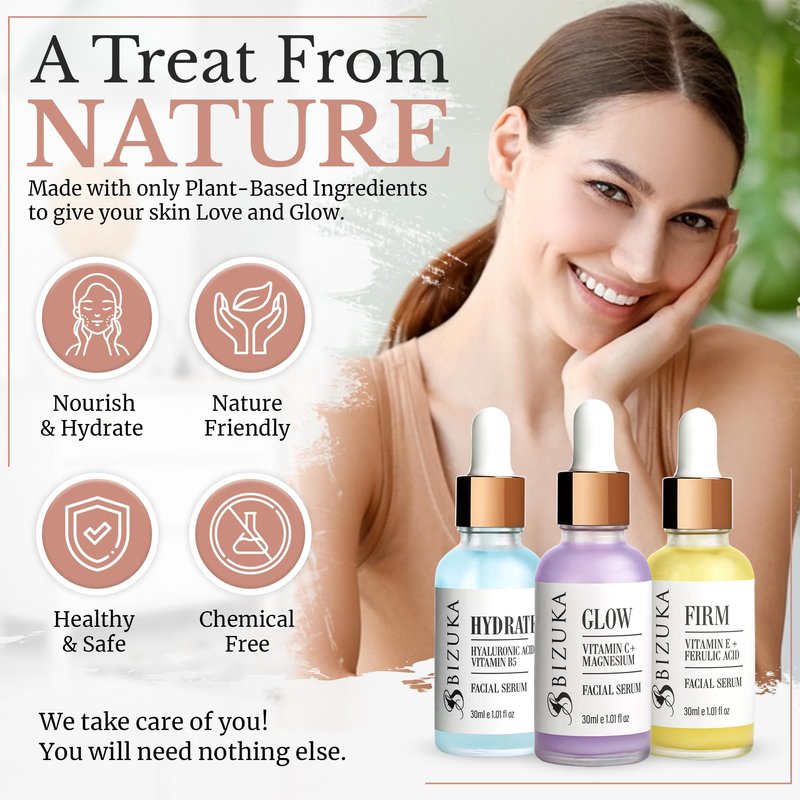 ➤ This set has everything you need to brighten, tighten & hydrate your skin, reduce dark spots, smooth, and hydrate the skin. Our bundle contains the top selling serums for your skin. Hydrate, glow and firm, 3 of 1oz bottles, all your skin needs as a treatment to reduce age fine lines and wrinkles. The BIZUKA face skin serum will help to avoid the appearance of age spots, and to maintain a soothing elasticity to the skin.