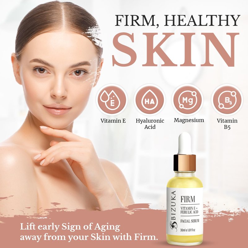 FIRM - Vitamin E+ Ferulic Acid ➤ Dermatologist-tested, made for all skin types and tones. Use in the evening to reduce the appearance of fine lines and wrinkles, sagging skin, uneven skin tone sun damage, dull skin, brown spots and age spots, crows feet, large pores. Results in firmer, smoother, wrinkle-free skin. DISCOVER BEAUTY IN PLANT-BASED INGREDIENTS➤ Serums are made with the natural ingredients only. No sulfates, no parabens, cruelty free. Not tested on animals. Bizuka serum is everything you need to give your face skin the perfect treat.