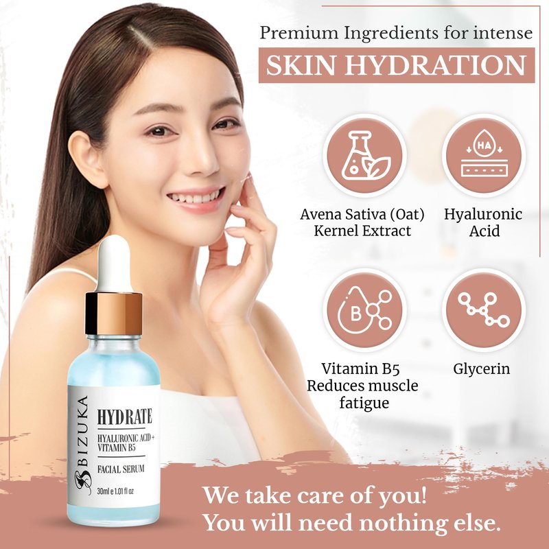 HYDRATE - With Pure Hyaluronic Acid Serum + Vitamin B5 ➤ BIZUKA face skin serum is supercharged with a powerful anti-aging complex that includes Vitamin B5 to increase efficacy and bring back skin elasticity. Apply 2-4 drops of Bizuka face serum onto the hand or applicator. Apply the serum as a thin layer on your face, neck, and décolleté.