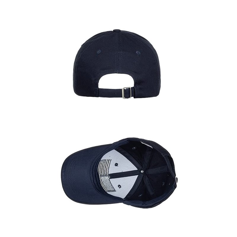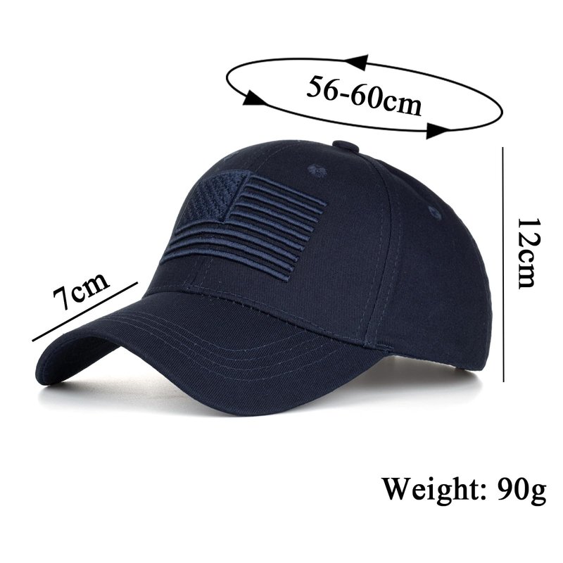 - USA Casual Baseball Cap, front is decorated with Black embroidered 3D American flag. Structured 6 panel. 6 sewn eyelets for ventilation.