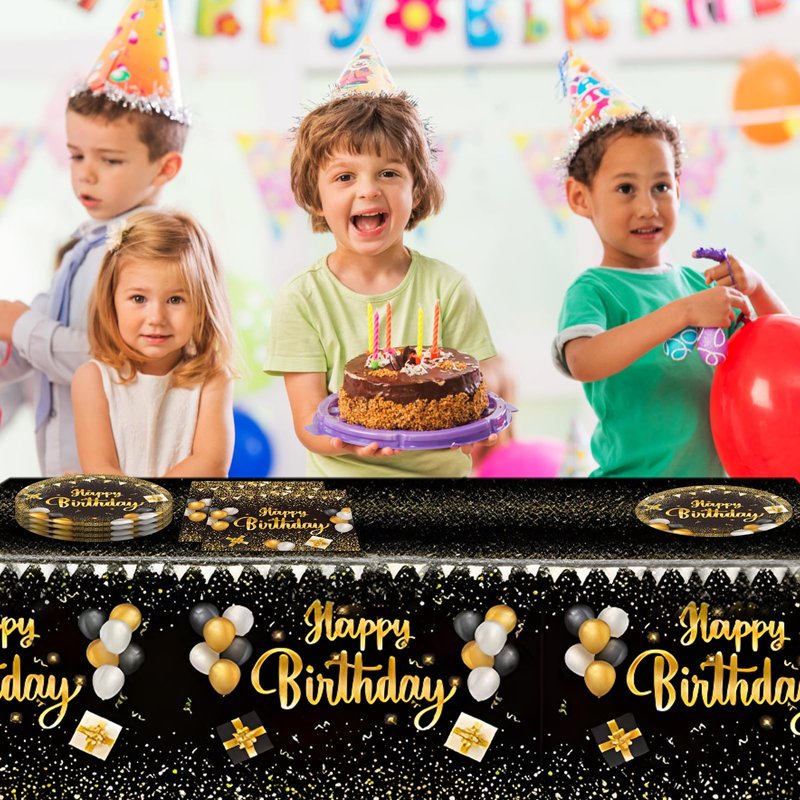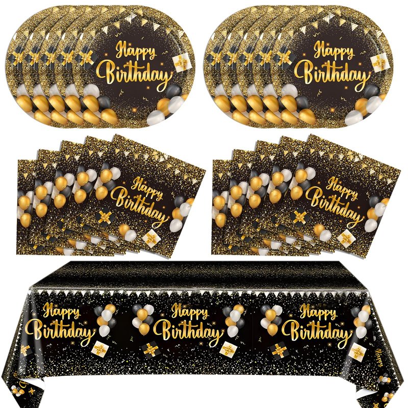- You will get: this black and gold party decorations serve 20 guests, including 20 pcs Happy Birthday plates of 7 inch, 20 pcs Happy Birthday napkins, 1 pcs Happy Birthday Tablecloth,Their attractive and fashionable appearance and wide range of uses determine that they are a good gift choice for your friends, family, colleagues, etc