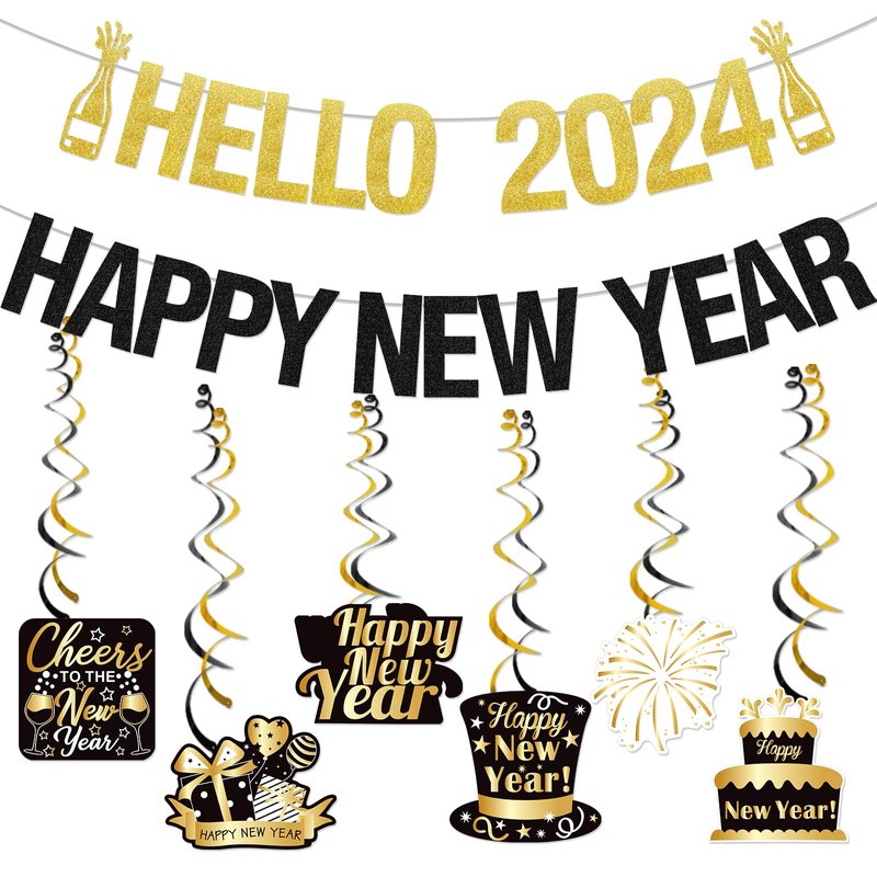 - 【What You Will Get】: 1 pcs gold and black glitter happy new year Banner, 6 pcs new years eve party supplies 2024 hanging swirl. The happy new year decorations 2024 provide everything you need to decorate your new years eve party!