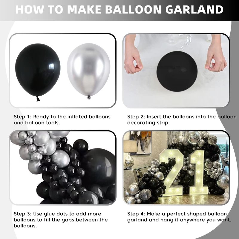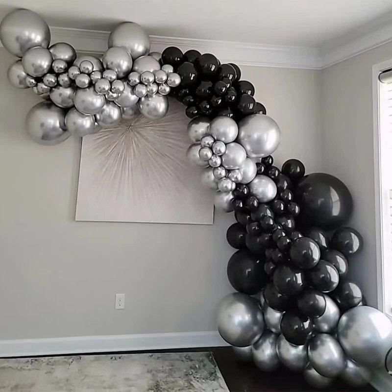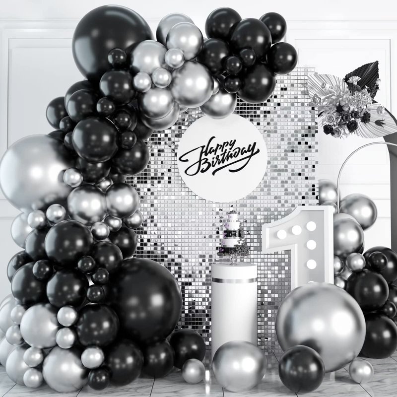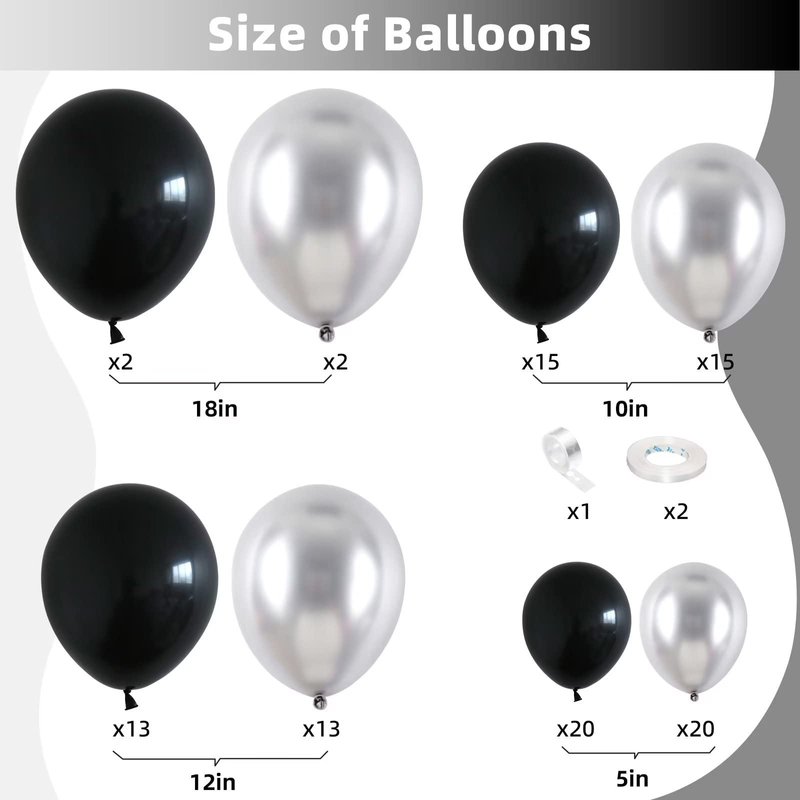 - 🎈100 PCS METALLIC SILVER BLACK BALLOONS: Make every party unforgettable with our valued balloon set! You'll receive 100pcs of balloons in different sizes (18/12/10/5 inches), along with 1pcs of ribbon and 1pcs of balloon chain. With unique designs, these balloons are perfect for any occasion. Get ready to effortlessly create stunning balloon decorations that will leave your guests in awe!