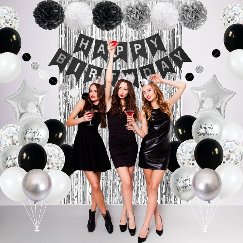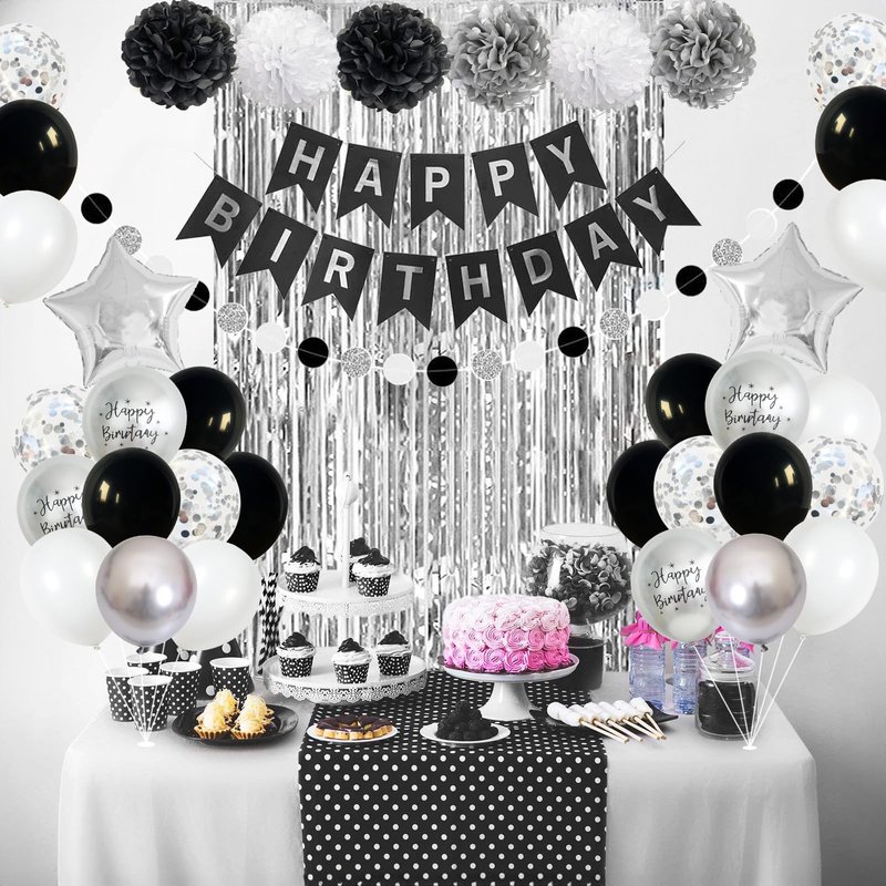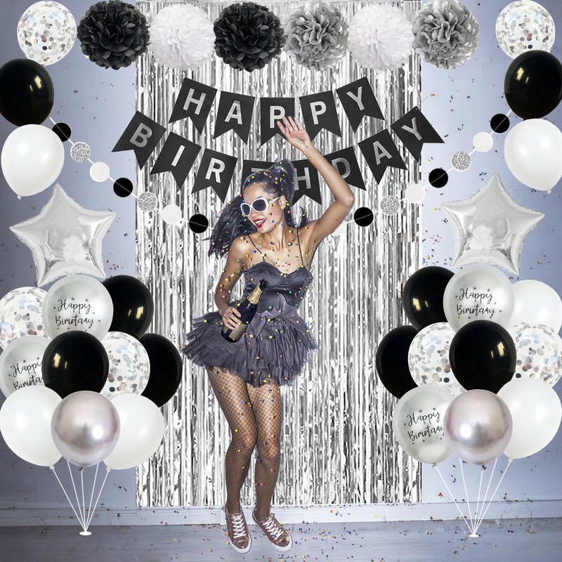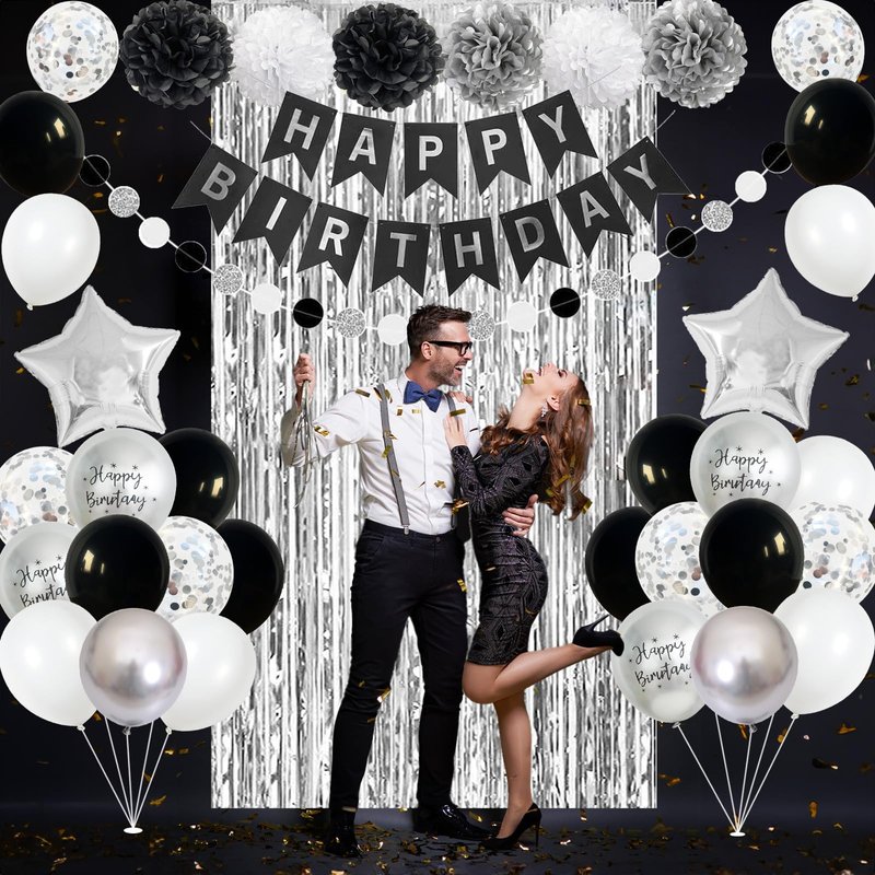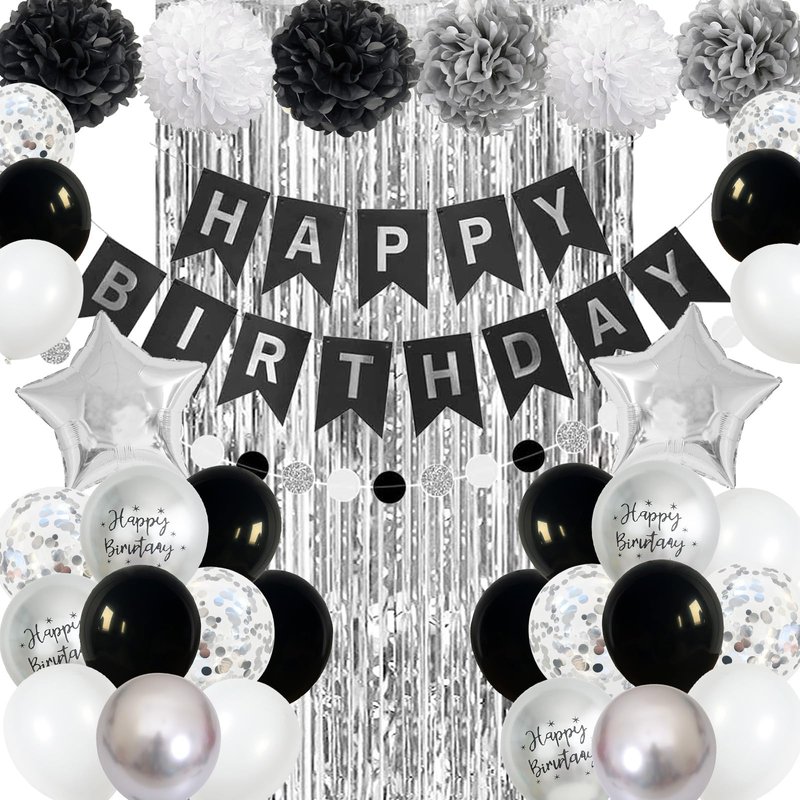 - π Premium Material - Our women men boys girls black white silver birthday decoration banner is made of high-quality thick cardboard, durable. And the black white birthday decorations balloons are made of high-quality aluminum foil and durable latex, sturdy and reusable. Supported with air or helium, which will stay inflated for a long time, safe to be used around kids. You can easily inflate and deflate these silver black birthday party supplies for her him.