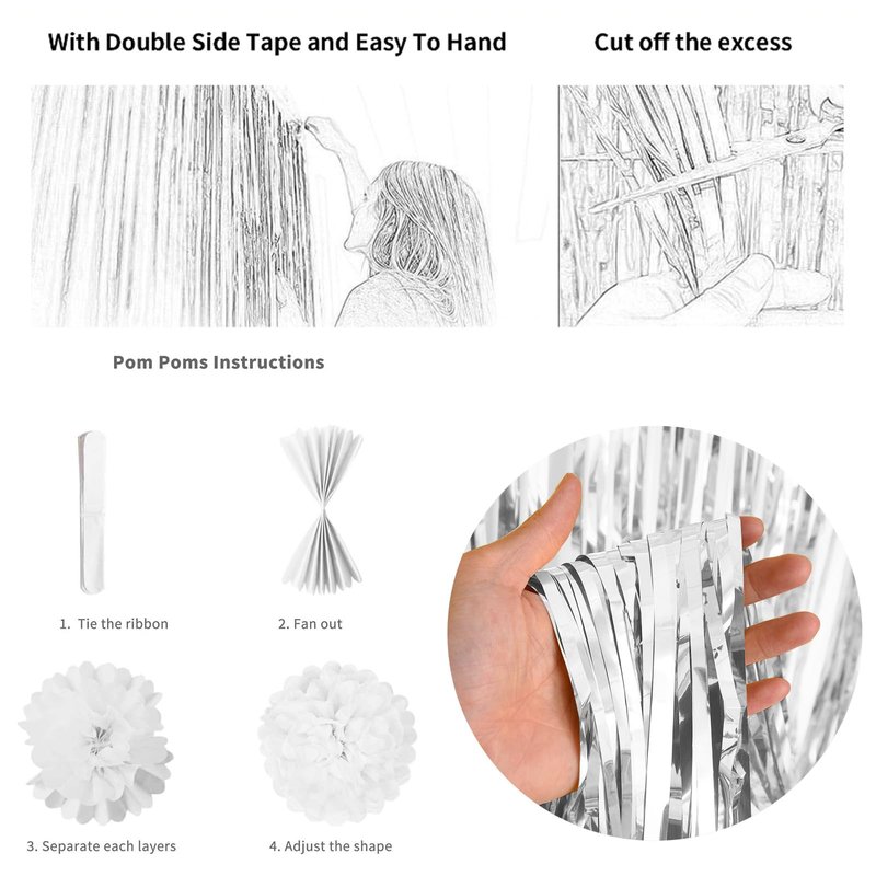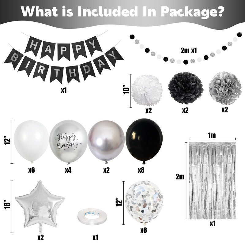 - π Silver Black Party Decorations - You will get 1pc 1m * 2m silver foil fringe curtain, 2pcs white pom poms, 2pcs black pom poms, 2pcs silver pom poms, black happy birthday banner, silver black white happy birthday buntting, 2pcs 18inch silver star foil balloon, 12inch balloons ( 6pcs silver confetti balloons, 8pcs black birthday balloons, 6pcs white party balloons, 4pcs mettalic silver print balloons, 2pcs mettalic silver helium balloons), 1pc balloon ribbon.