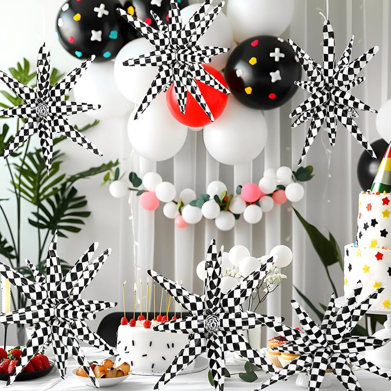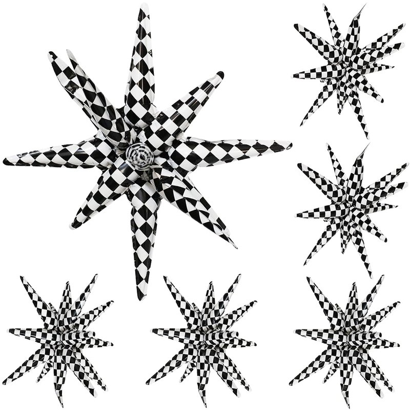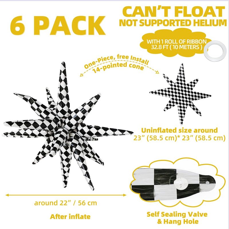 - 14-POINTED STAR CONE BALLOONS CHECKERED RACING PARTY SUPPLIES★ Our 14-pointed star cone balloons star explosion party supplies, race car birthday supplies, pack of 6, black white checker balloon, uninflated size is around 23'' (58.5 cm) (it is around 22'' when inflated), double side printed & more thicken than other.