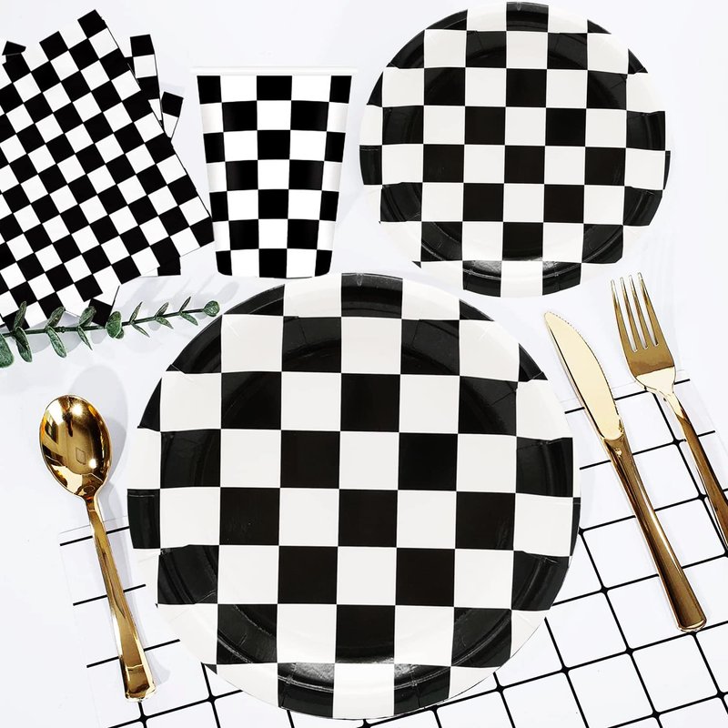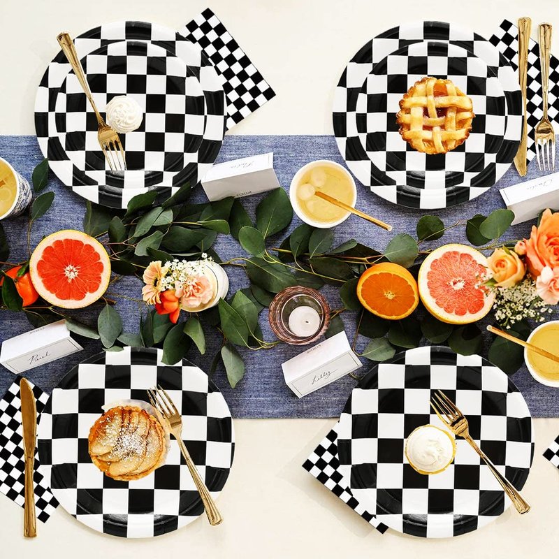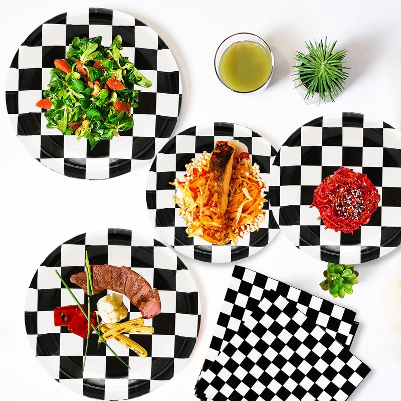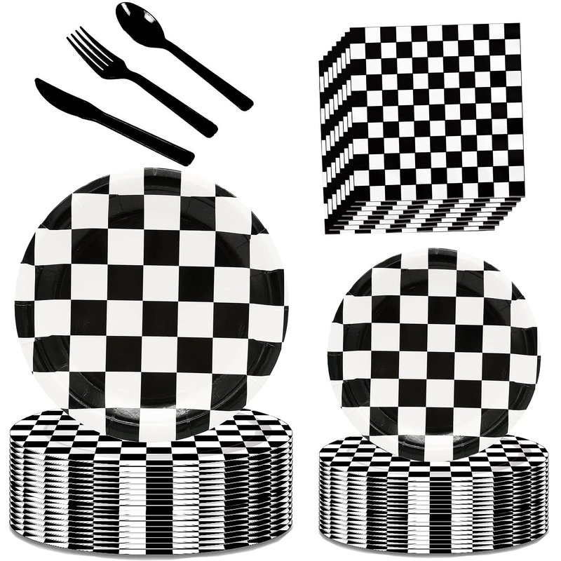- 【SERVES 25 GUESTS】:This Black and White Checkered Party Sets has all you need for 25 guests,includes 25pcs 9'' Dinner Paper Plates,25pcs 7'' dessert Plates,25pcs paper Napkins,25pcs forks,25pcs spoons,25pcs knives.