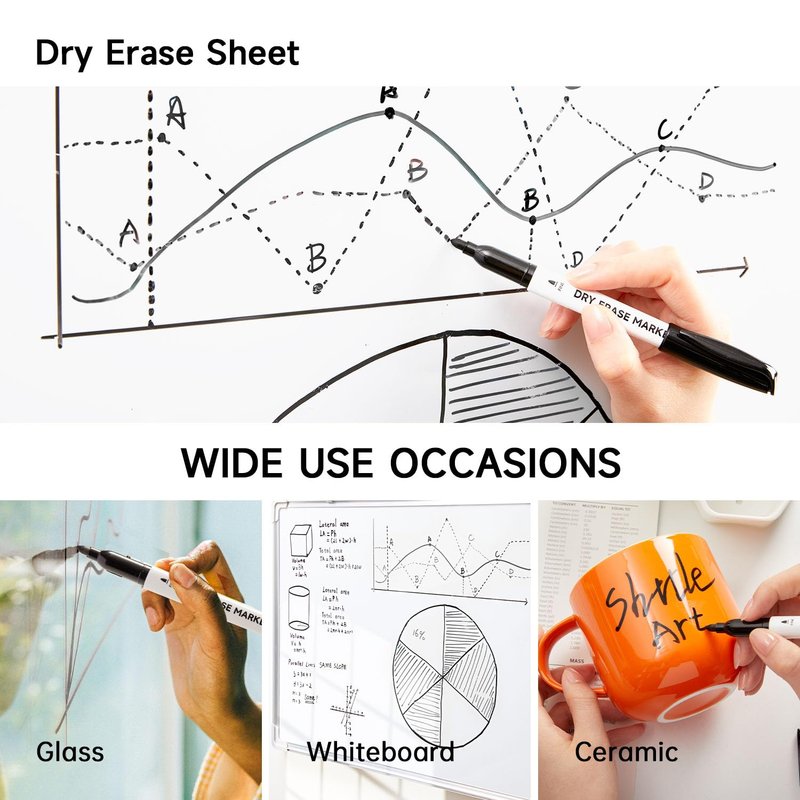 - Writing smoothly and drying quickly. Easily wiped off from whiteboards, glass, mirror, ceramic tiles and most non-porous surfaces with a cloth or eraser. The kit is suitable for both adults and kids. It also has a great many applicable places such as home, classrooms,offices, the boardroom, conference room,studio and so on.