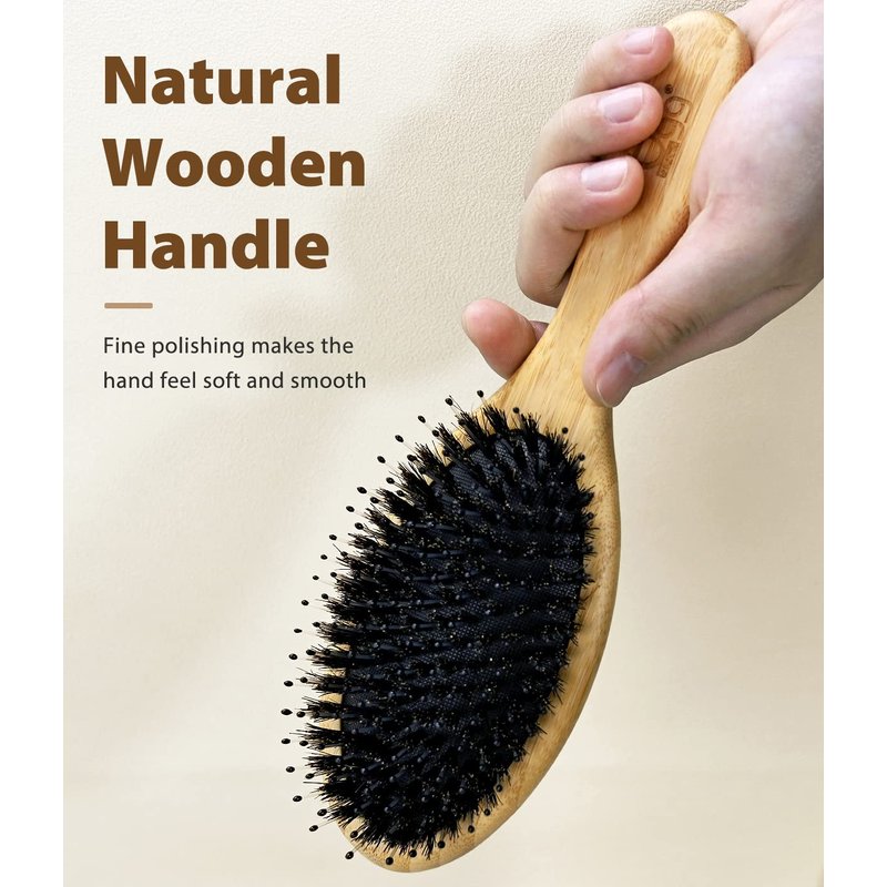 Black Egg Boar Bristles Detangling hair brush, body made of bamboo, Boar Bristles help massage scalp and spread sebum, add shine and volume, hair will be healthier. And added nylon pins easy to remove knot and tangles, suitable for all hair types.