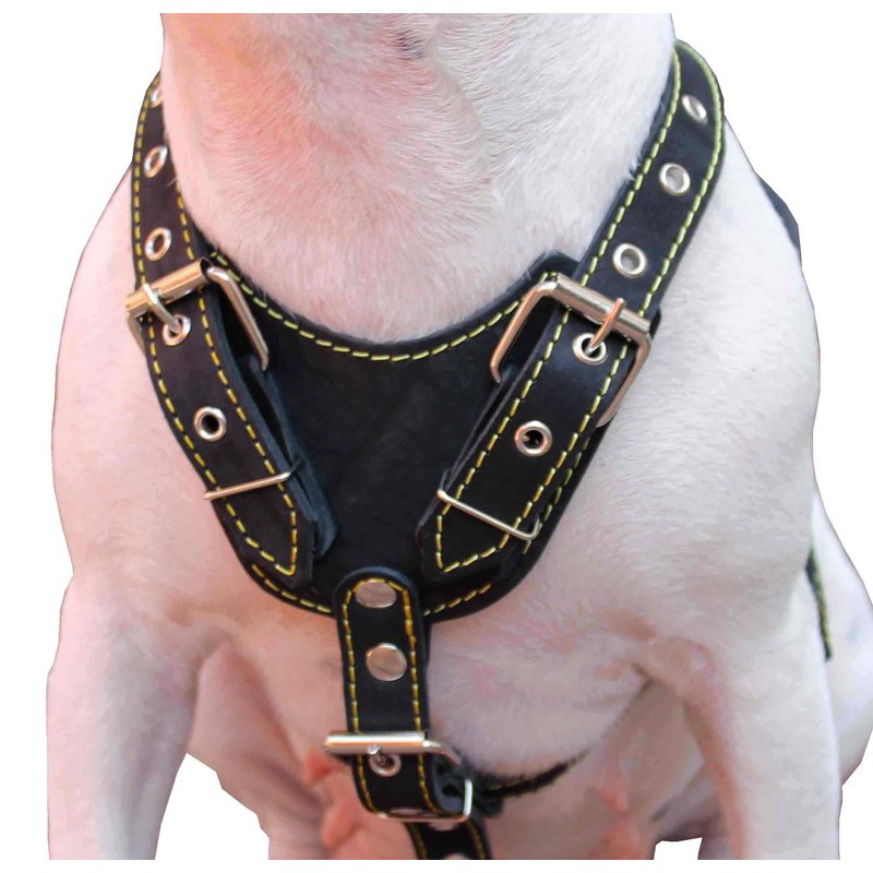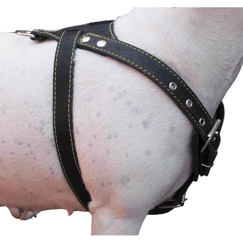 Made of 1" wide genuine leather. Strong and comfortable, wide chest piece designed to equally distribute tension. Trimmed with thick contrast color waxed thread. Best choice for daily walks and training. This size is recommended for Medium breeds, sized to fit 25.5-29 inches chest circumference.