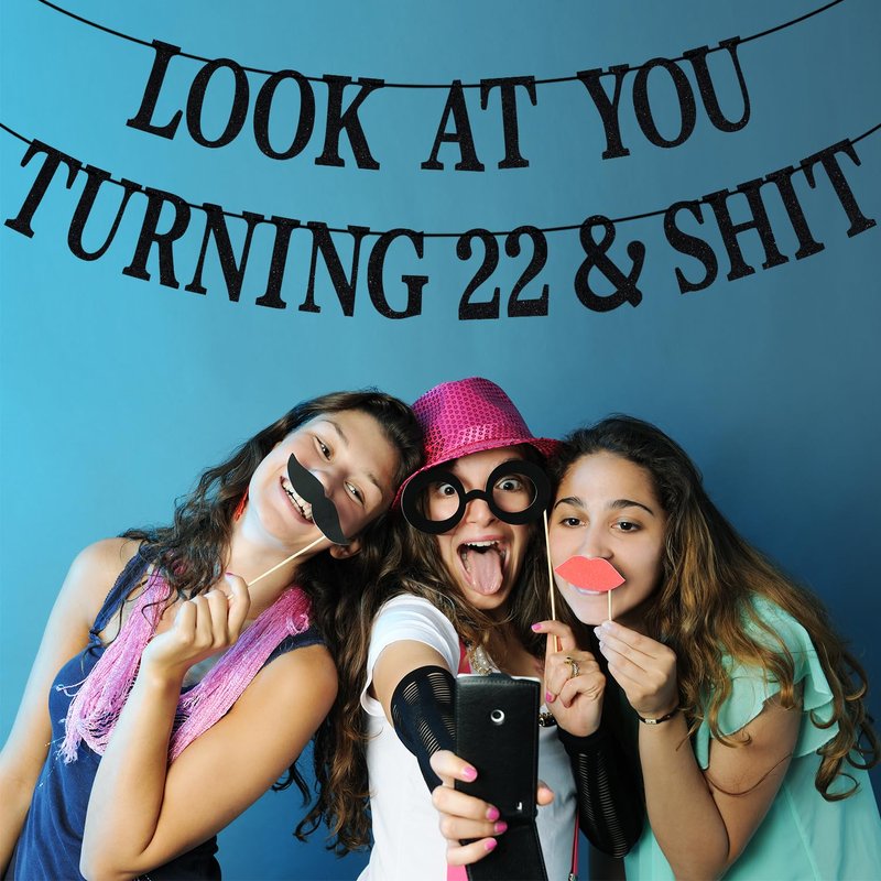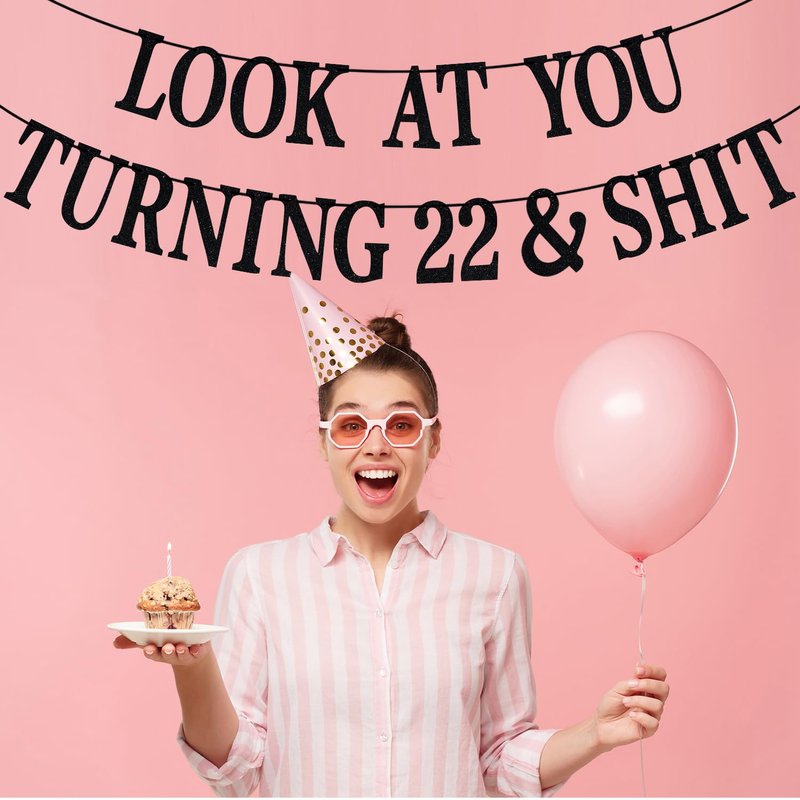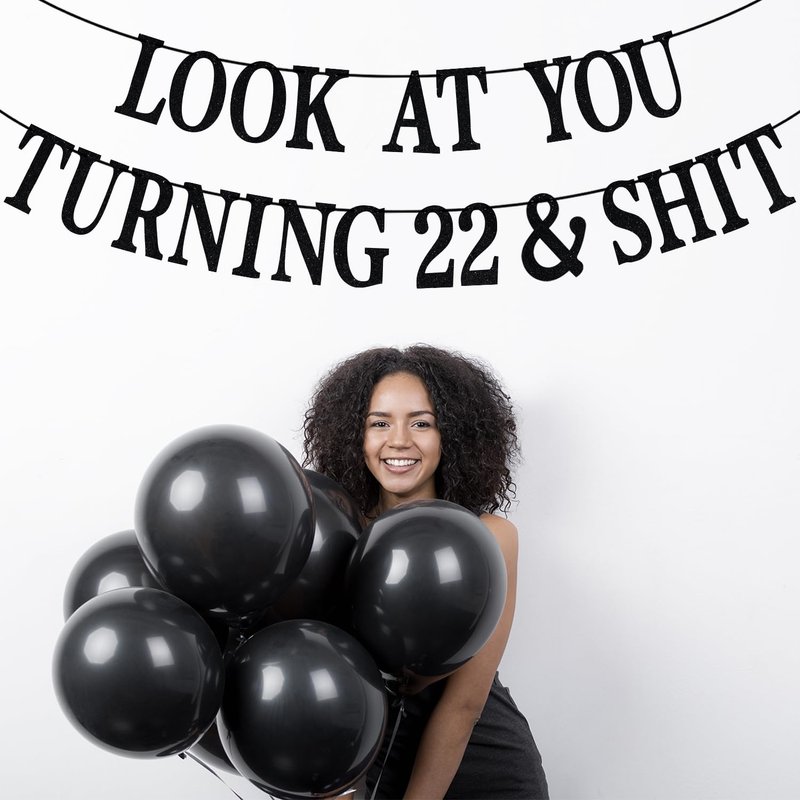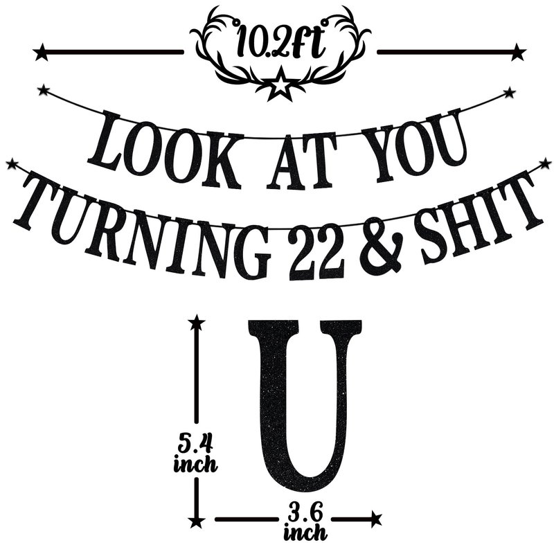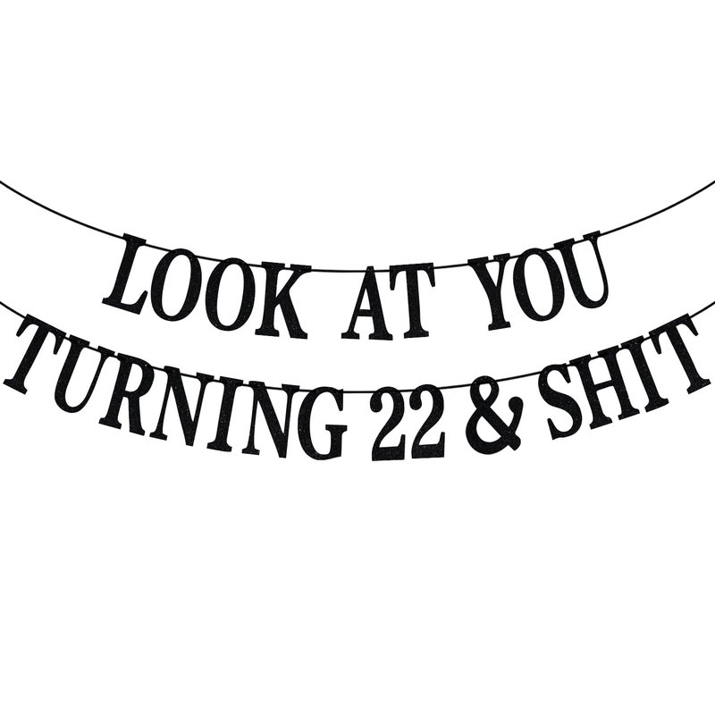 Black Glitter Look at You Turning 22 & Shit Banner, Happy 22nd Birthday/Level 22 Unlocked/Cheers to 22 Years, Funny 22nd Birthday Party Decorations Supplies
