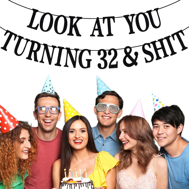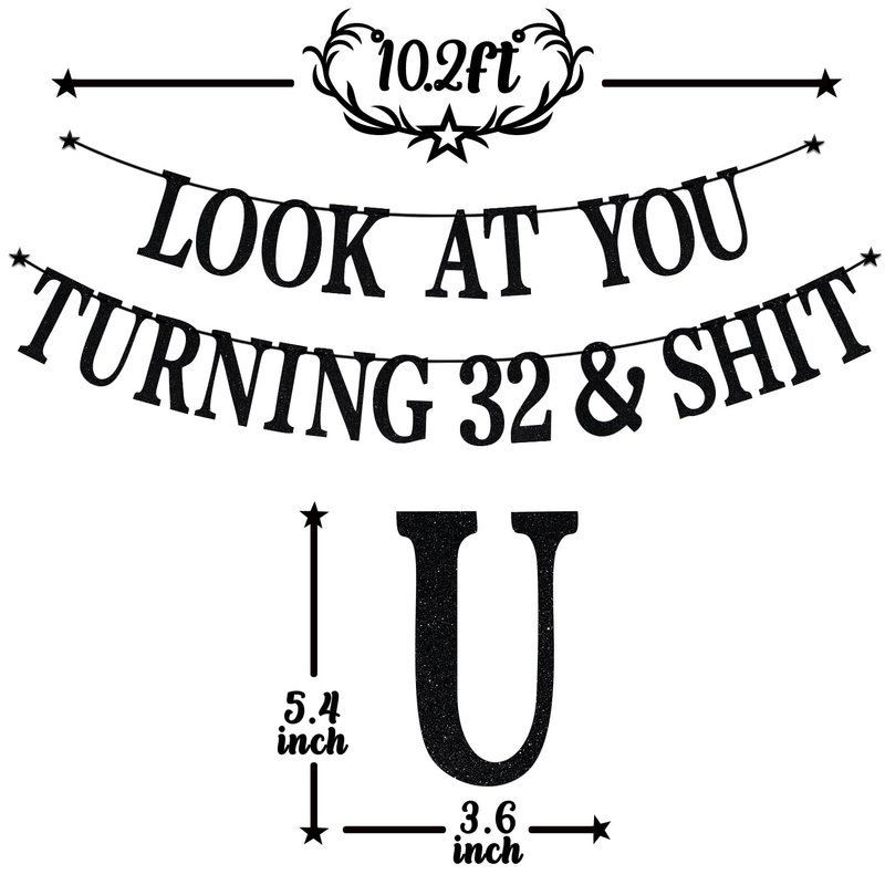 Black Glitter Look at You Turning 32 & Shit Banner, Happy 32nd Birthday/Level 32 Unlocked/Cheers to 32 Years, Funny 32nd Birthday Party Decorations Supplies
