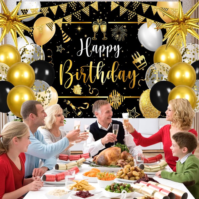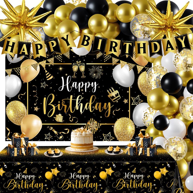 - Quality Material: This black gold happy birthday banner is made of quality cardstock, it can last for a long time after being decorated, black gold happy birthday backdrop is made of polyester, washable, and reusable. The black gold birthday tablecloth is made of waterproof plastic. The black gold white balloons are made of latex. You can inflate these latex balloons with air or helium, you can also blow them all up and spread them all around the room and on the tables