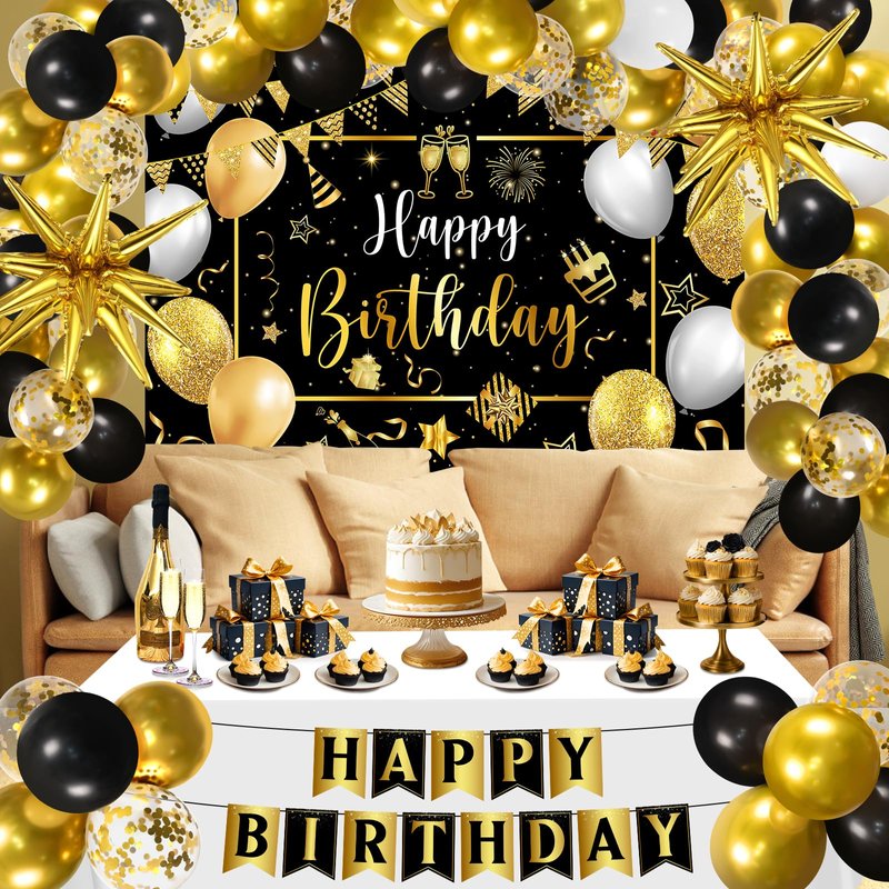 - Black Gold Birthday Decoration: The black gold happy birthday decoration kit is sparkling and eye-catching, combines with classical black gold birthday element and adorable patterns, such as balloons, pennants, stars, and sparkling fireworks, looks festive and the bright colors, suitbale for men and women, which can make your birthday warm and unforgettable