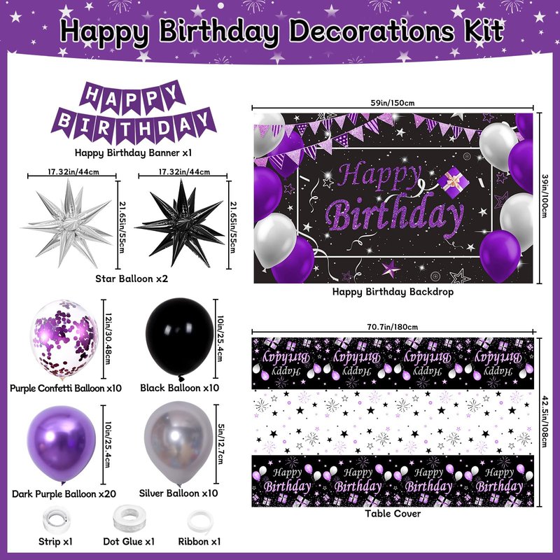 - Purple Party Decorations--- Includes 10" latex balloons 40pcs ( purple balloons 20pcs, black balloons 10pcs, silver balloons 10pcs ), 12" purple confetti balloons 10pcs, purple birthday backdrop cloth 59.1 x 39.4in (150x100cm), purple and silver star balloons(55x44cm), purple happy birthday table cover, dot glue, strip and ribbon.