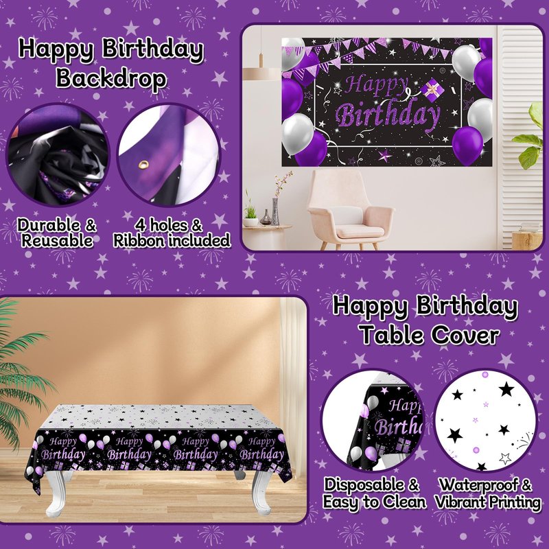 Black Purple Birthday Decorations for Women Girls Men, Purple and Silver Party Decorations Happy Birthday Backdrop Banner Confetti Star Silver Black Purple Balloons Arch Tablecloth Party Supplies