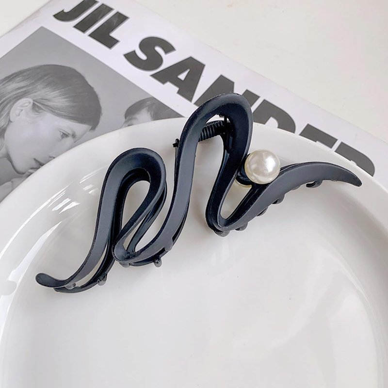 Black Ribbon Hair Clips Metal with Pearl Hair Accessories for Women Girls Elegant Curve Wave Hair Claw Clips Shiny Hairpins Strong Hold Nonslip Hair Clip for Thick or Thin Hair Goddess Look 1 Pcs