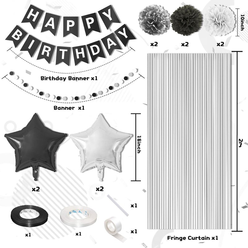 - Birthday Decorations Set: This quality black and white birthday decorations set includes everything you need: 1×Happy Birthday banner, 1×star garland, 2×purple fringe party curtains, 12-inch-5×white birthday balloons, 5×metallic silver, 5×black, 5×silver confetti, 10-inch-6×tissue paper pom, 18-inch-4×foil star balloons, 2×ribbon, 1×dispensing. With these black white silver balloons, you’ll have all the essentials to make your party stand out!