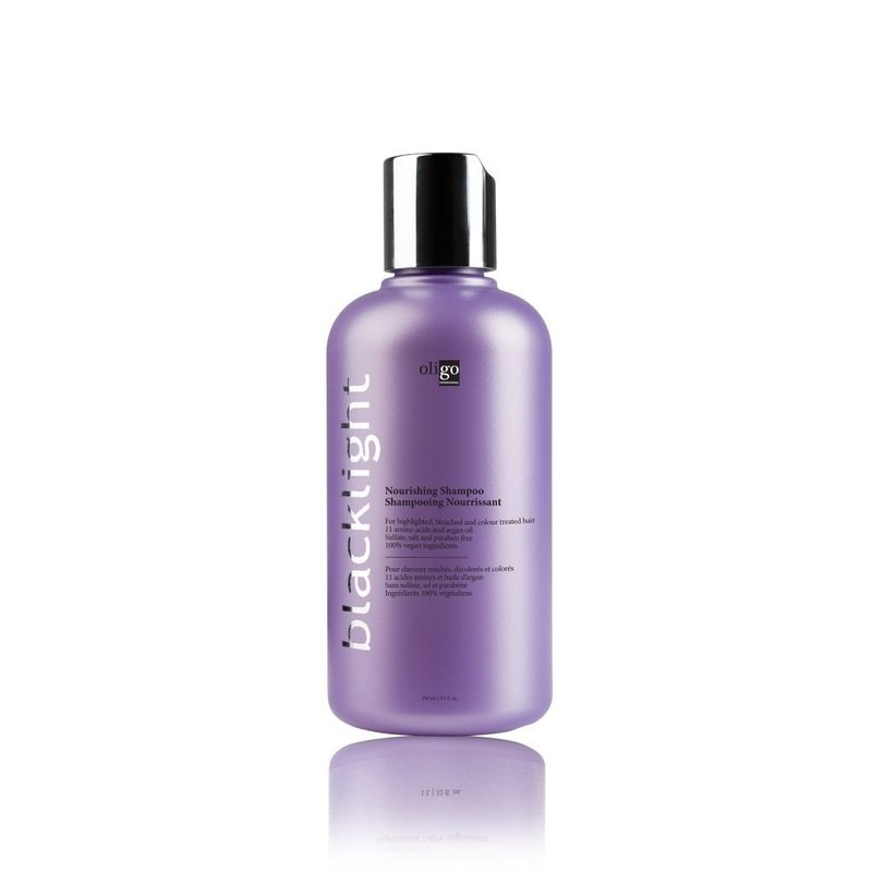 Oligo Blacklight Nourishing Shampoo 8.5oz/250ml is formulated to help replenish highlighted, bleached, white, and natural blonde hair in need of moisture and weightless conditioning. Its unique formula is sulfate, salt, and paraben-free and enriched with 11 amino acids and argan oil, which are commonly used in hair care products for their purported benefits. To use, apply to wet hair. Lather, massage, and rinse. Follow with Blacklight Nourishing Conditioner. Use it when you feel like your hair has lost its color or shine and is less manageable than you want. Our nourishing shampoo can form part of your color-retaining nourishing hair products.