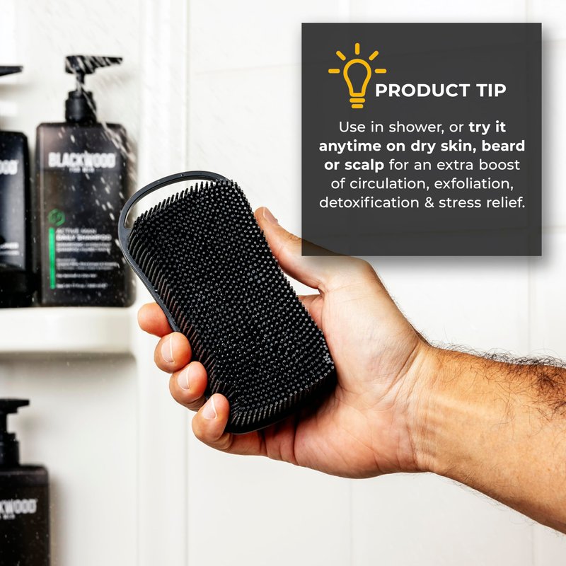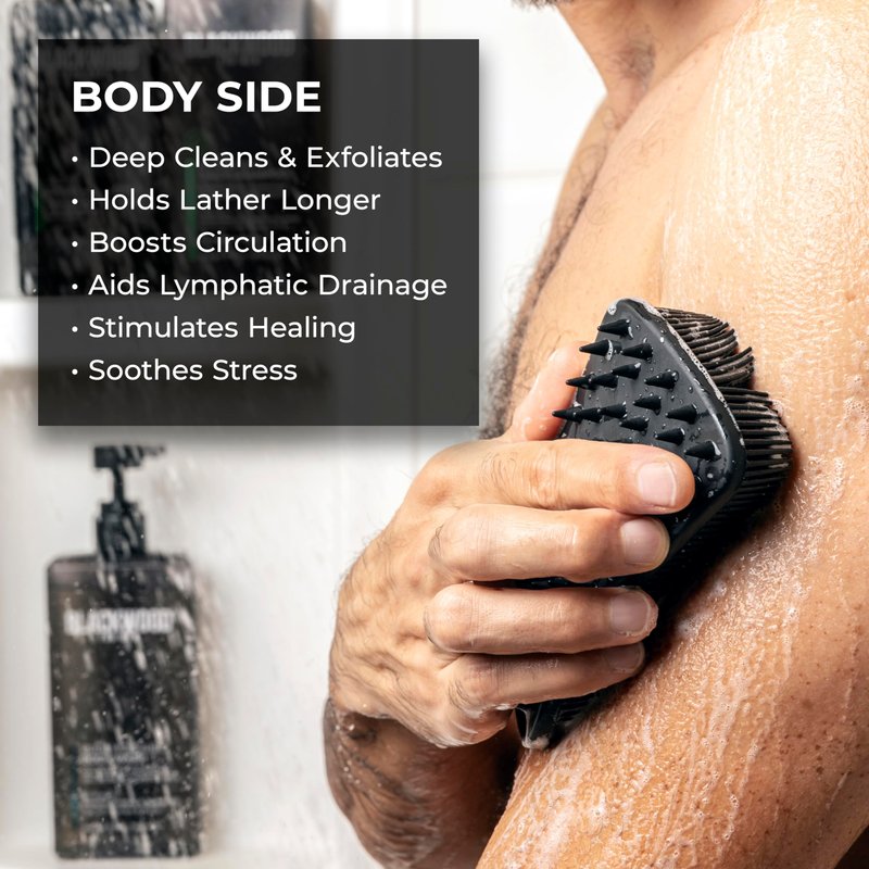 Blackwood For Men Double Duty Beard & Body Scrubber - Dual-Sided Men's Shower Tool - Handheld Body Wash Brush with Long Soft Silicone Bristles for Deep Cleaning - Short Exfoliating Tips for Beard Care