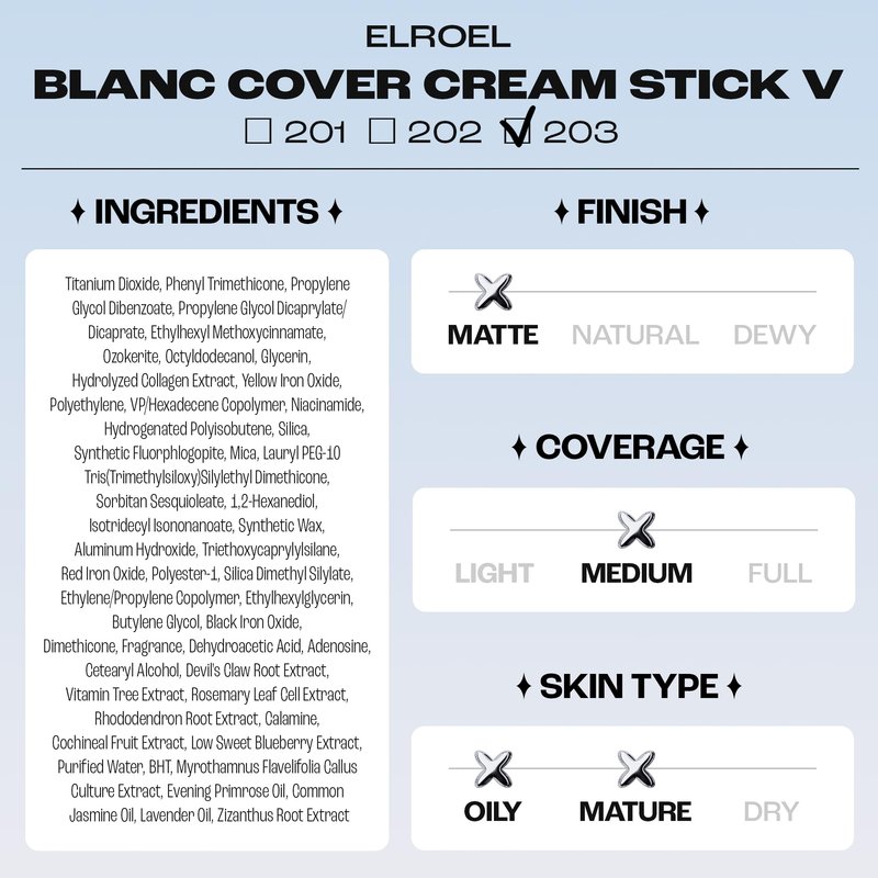 Experience the versatility of the BLANC Cover Cream Stick V, an innovative concealer and foundation in one convenient package. Its exclusive formula transforms from a hydrating cream to a foundation stick, perfectly adjusting to your skin tone. Available in 3 shades—201 Light, 202 Natural, and 203 Medium—it offers exceptional coverage for fine lines, pores, and imperfections, while key ingredients like French collagen and Volufiline help enhance skin volume and moisture. Infused with Desert Plant and Flower Oil Extracts, this cover stick delivers up to 50 hours of hydration for a refreshed and polished look.