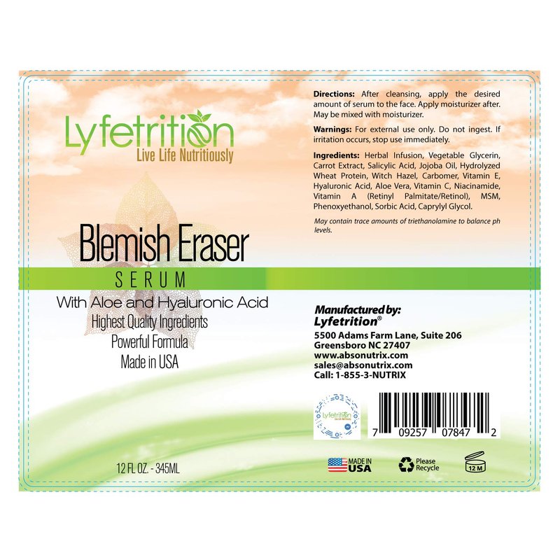 - 💪 YOUR SKIN WILL BE THANKING YOU FOR THIS. Lyfetrition Blemish Eraser Serum is proudly made in America using the finest, all-natural ingredients. We have added pure and organic Hyaluronic Acids that are really helpful at fighting off free radicals while also working to heal your skin against the damaging effects of UV rays.