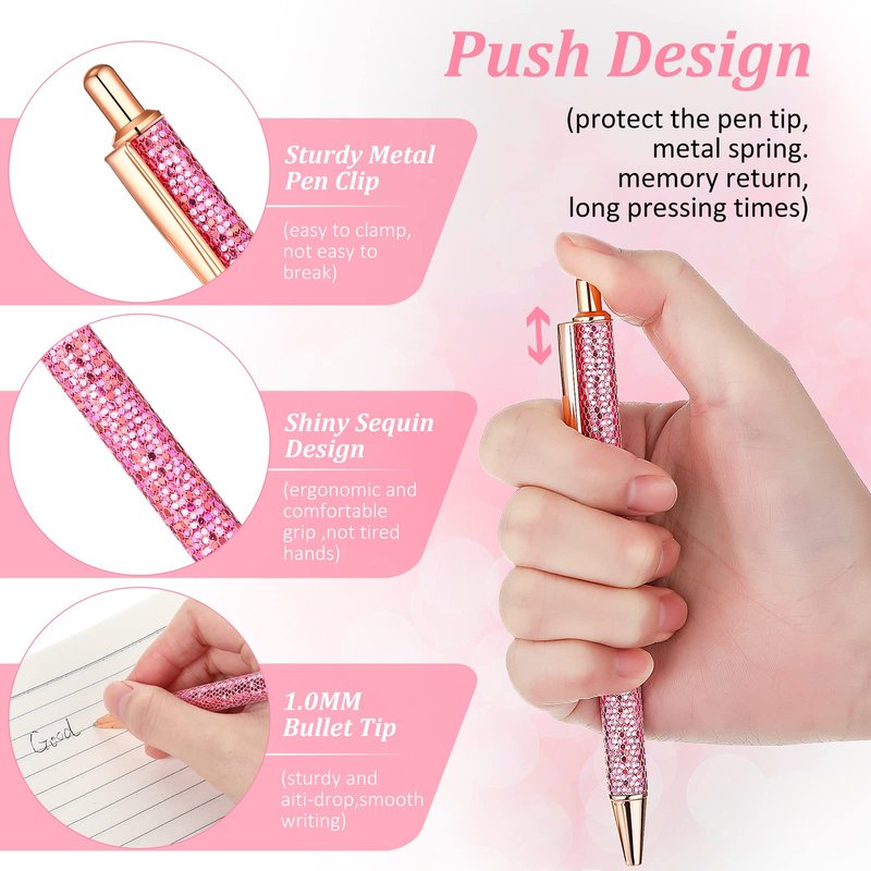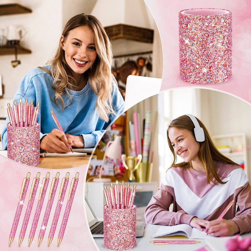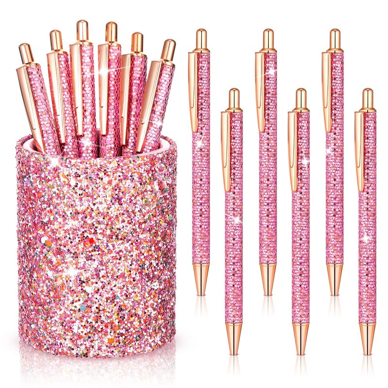 - Get: package contains a bling bling pink leather pen holder and 6 sequin pens in pink color, put them together on your desk to make your desk look stylish and attractive