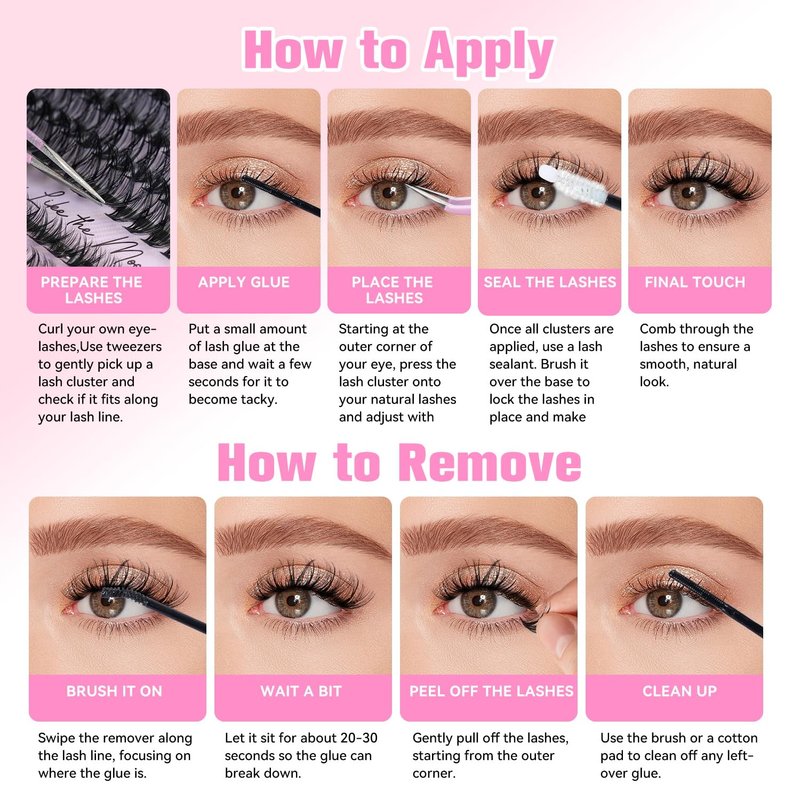 - Gentle and Lightweight: Made from soft, lightweight materials, these lash clusters offer a feather-light feel for all-day comfort. They blend seamlessly with your natural lashes, enhancing volume and length without weighing down your eyelids—perfect for a natural, effortless look.