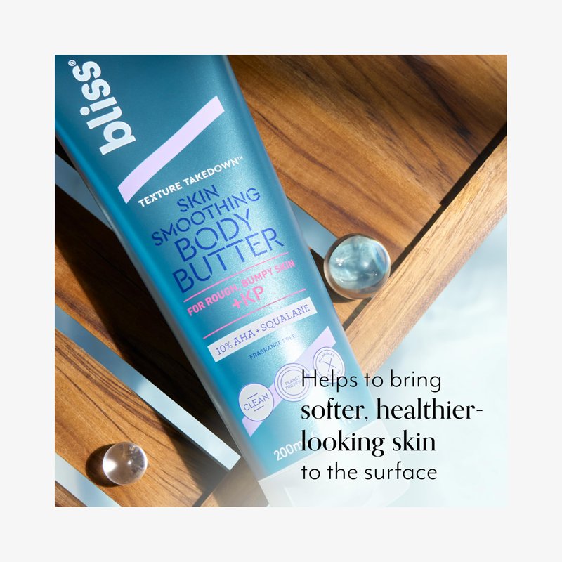 - TEXTURE TAKEDOWN SKIN SMOOTHING BODY BUTTER: Bliss' unscented body lotion helps to reduce the look of rough and bumpy skin, even stubborn Keratosis Pilaris (KP) on arms and legs.