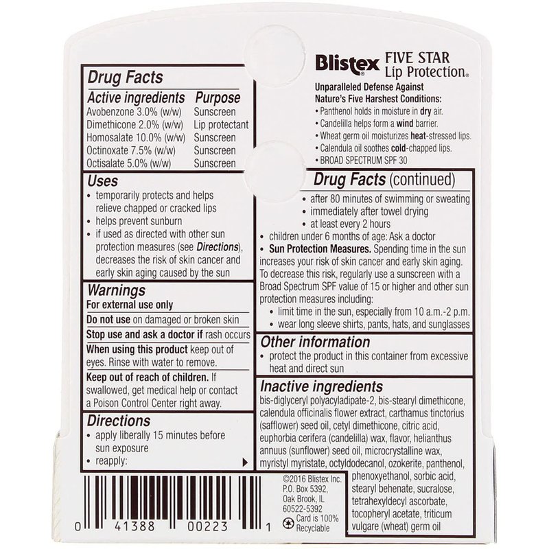 Blistex Five Star Lip Protection is a one-stop defense against nature's harshest elements. With its unique system of five specialized ingredients, it delivers unparalleled protection against dryness, sun, heat, cold, and wind. Whether you're braving the dry winter air or enjoying a day at the beach, this will keep lips soft, hydrated, and protected. NDC Code(s): 10157-1171-1