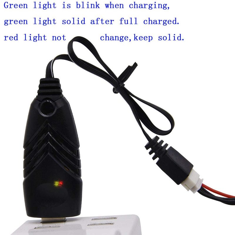 Green light is blink when charging, green light stop blink after full charged.Do not charge your battery if battery looks like damage. XH-4P 4 Pin white port, DC 5V 2A,Output 11.1V 1500mA, When charging, green light is blink and red light is solid