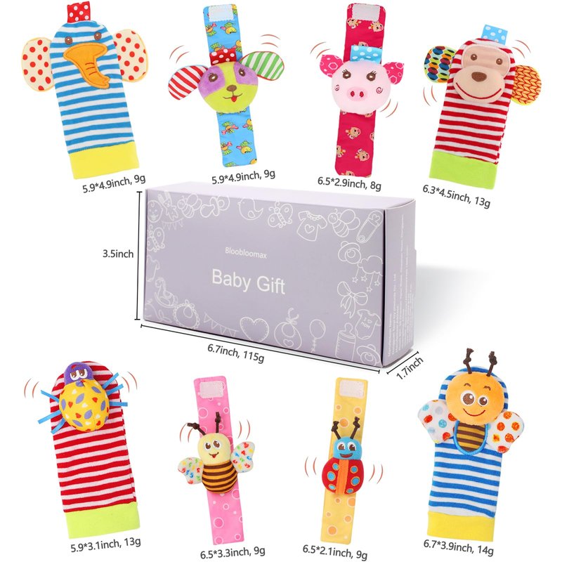 Bloobloomax Soft Baby Rattle Wrist Rattle Foot Finder Socks Set,Cotton and Plush Stuffed Infant Toys,Birthday Holiday Birth Present Gift for Newborn Boy Girl Kids Toddler (8pcs-B Set)