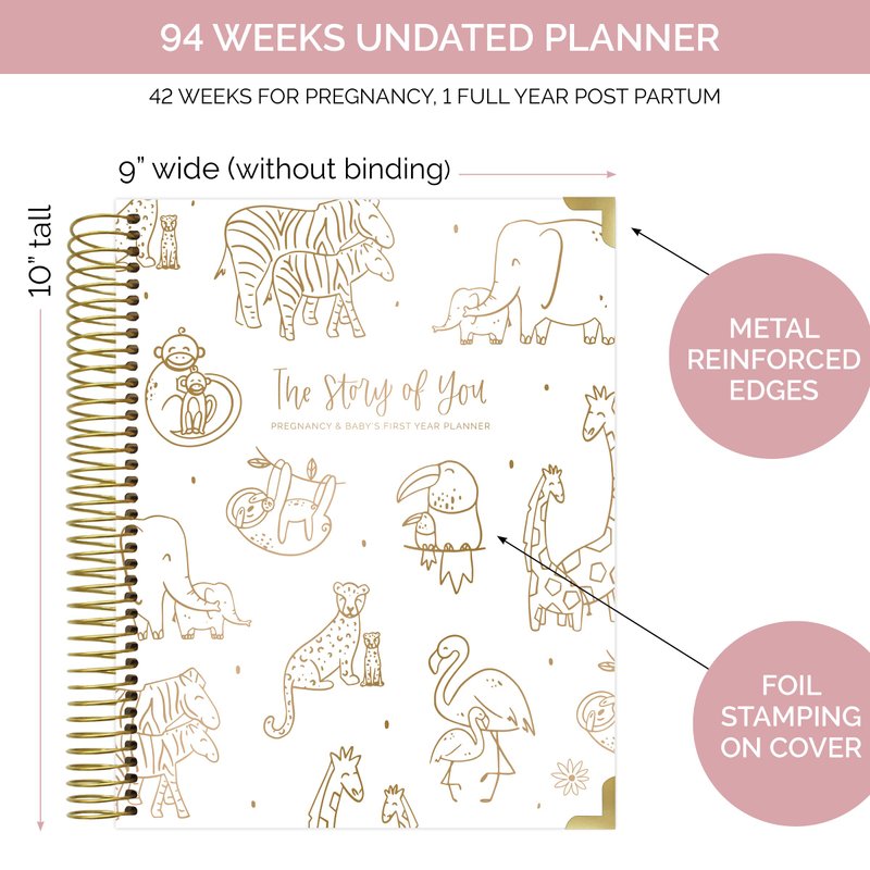 Congratulations, mama! With the help and feedback from hundreds of mothers, we’ve created this unique pregnancy and baby’s first year planner and keepsake journal. This book will serve as a planner, guidebook, medical log, journal, and scrapbook for everything from your pregnancy all the way up to your child’s first birthday! Our goal is for this resource to keep you organized, calm, and informed, because happy mamas make happy babies! Wishing you the best of luck through this life changing journey. We hope that you and your child treasure this book for years to come. We truly couldn’t be happier for you and your family! Specification and features include:
