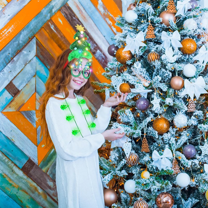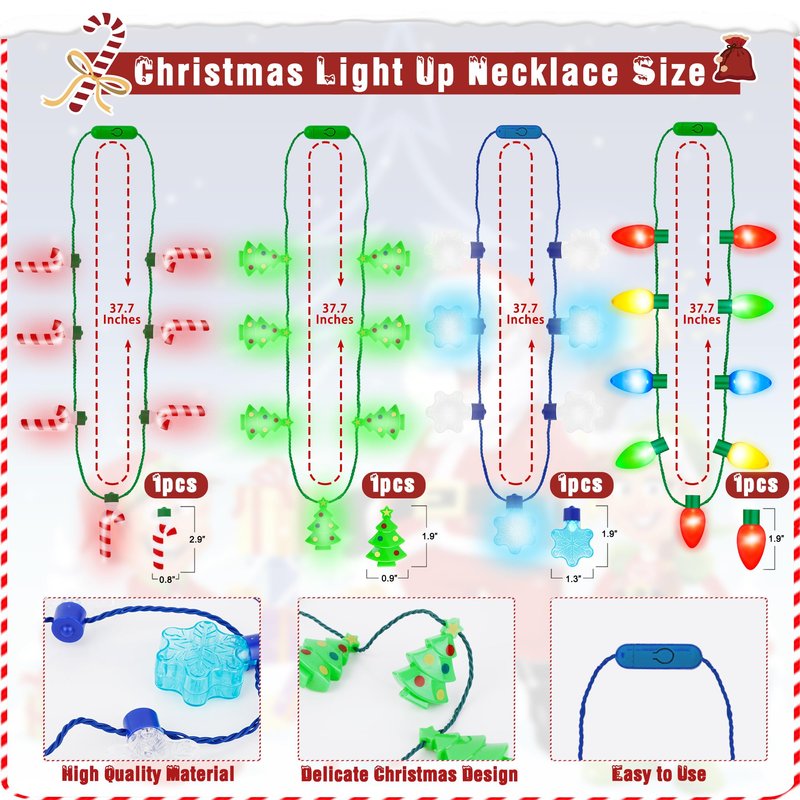 • Festive Christmas Designs: The Blowata Christmas LED party pack includes 4 Christmas headbands featuring classic holiday symbols like reindeer antlers, Christmas trees, and elf hats. Each pack also comes with 4 Christmas light necklaces and 4 pairs of glasses in assorted festive designs, such as candy canes, snowflakes, and Santa motifs.
