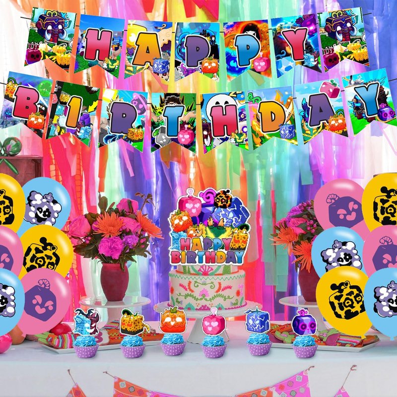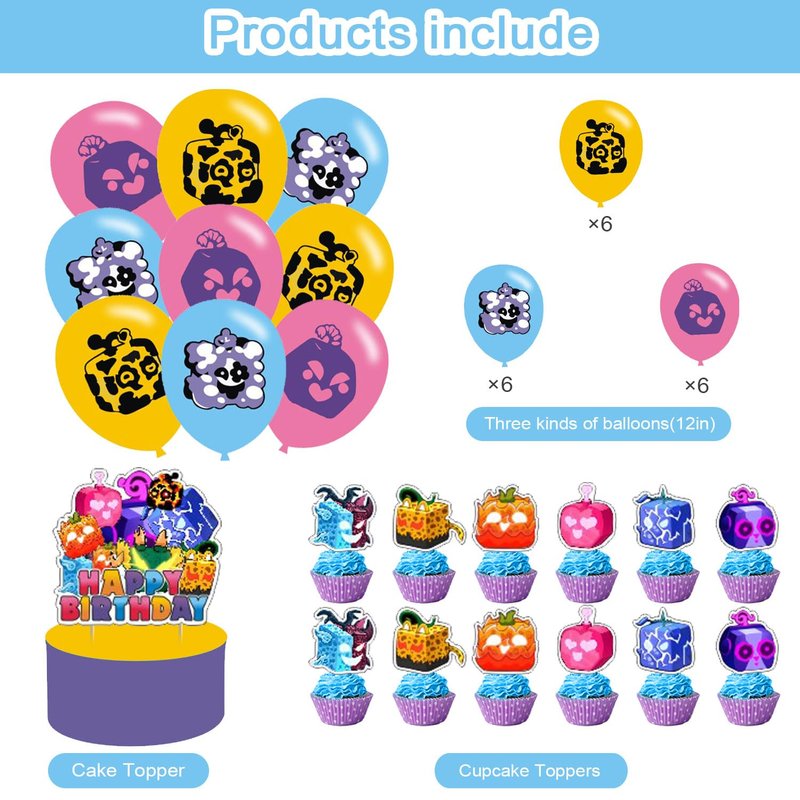 - 【Blox Fruits Package Included】1pcs Happy Birthday Banner,18pcs Latex Balloons,12 Pcs Cupcake Toppers,1 Pcs big cake topper. Our Complete Set of Blox Fruits Birthday Party Supplies Will Add Amazing to You, Your Family And Friends