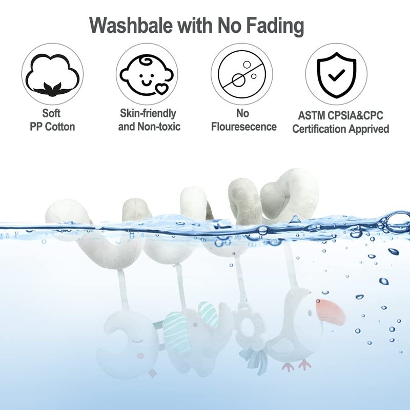 The hanging sprial car seat toy is soft and comfortable, filled with high-quality PP cotton, cute doll and BB squeaker to attract the baby's interest, the montessori toys can promote the baby's cognitive ability and sensory development, suitable for car seats, prams, bassinets, cots, accompanied by the baby's happy growth