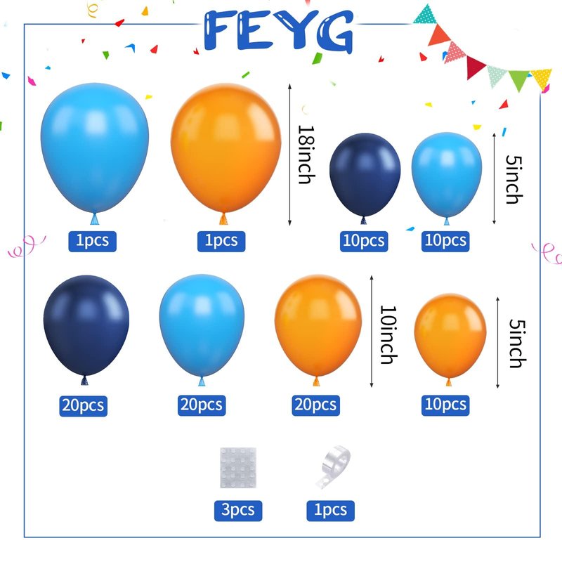 - Blue and Orange Balloon Arch:include 1*18 inch orange, 1*18 inch light blue, 20*10 inch orange, 20*10 inch light blue, 20*10 Inch navy blue, 10*5 inch orange, 10*5 inch light blue, 10*5 inch navy blue, 1 * balloon chain; 3 * dispensing