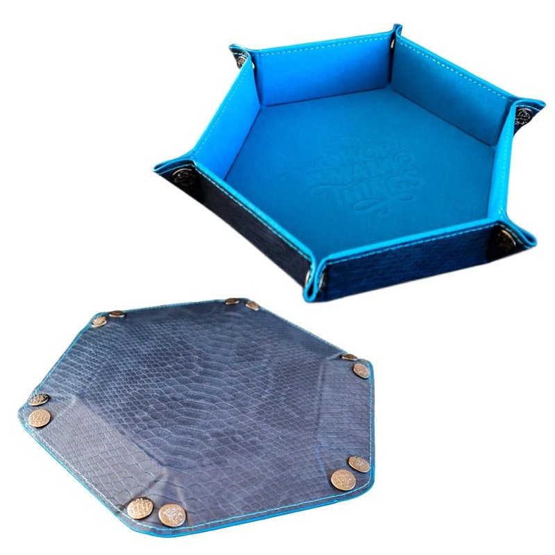 Official Blue Dragon Leather Dice Tray from The Shop of Many Things. Not only does a Dragon Leather Dice Tray look super epic, but it also protects your table! Show off your dragon-slaying prowess and stop your dice scooting off into oblivion, or knocking over the minis... (I’m looking at you Jeff). It's called Dungeons and Dragons, not Dungeons and Cows, so ditch your nasty fake leather tray and bring some real Dragons to the table! This Dragon Leather Dice Tray comes in three colors and is durable enough to prevent even the most aggressive of metal dice from causing harm to surfaces. Order your color of choice or a bundle of 3 and really stick it to the scaly beasts! Disclaimer: No actual dragons were harmed in the making of this product. Collapses down flat for easy storage and transport, never miss a game with your favorite dice tray!