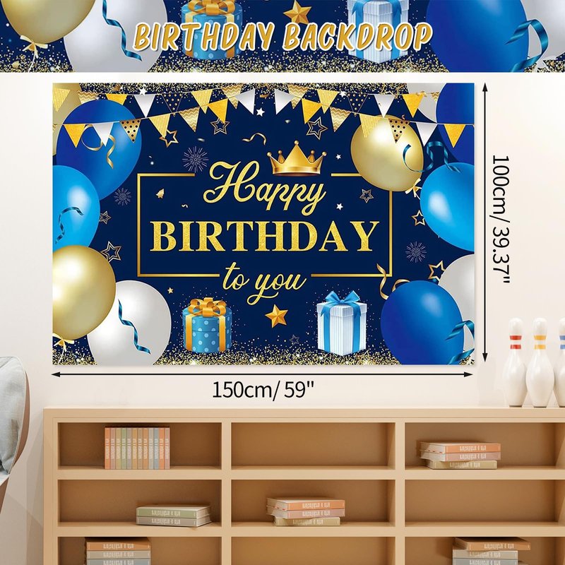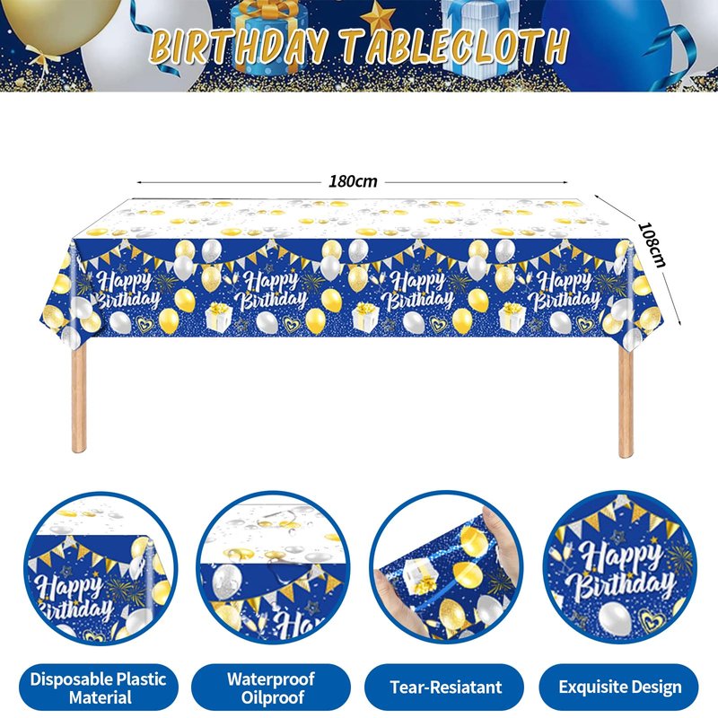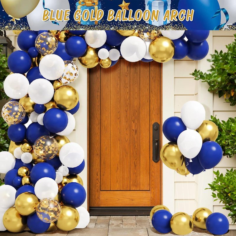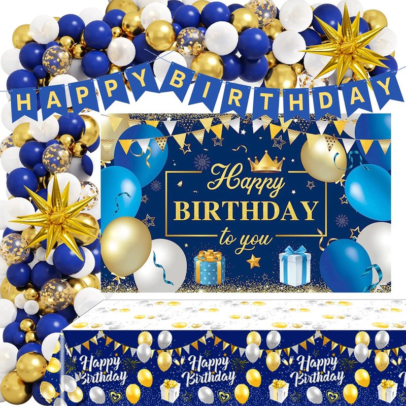 - 【Blue Gold Birthday Decorations 127PCS】Package includes: Happy Birthday Backdrop x1, Tablecloth x1, Happy Birthday Banner x1set (13 Lettters, 1 Ribbon), 22in Star Balloons x2pcs, 12in Balloons x45pcs (White x30, Confetti x15), 10in Navy Blue Balloons x40pcs, 5in White Balloons x20pcs, Tying Tool x1, Balloon Chain x1, Dot Glue x1, Ribbon x1